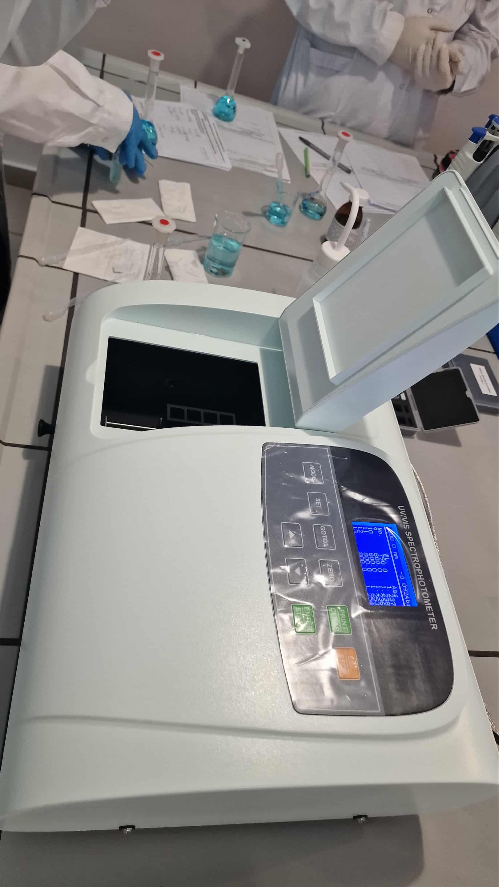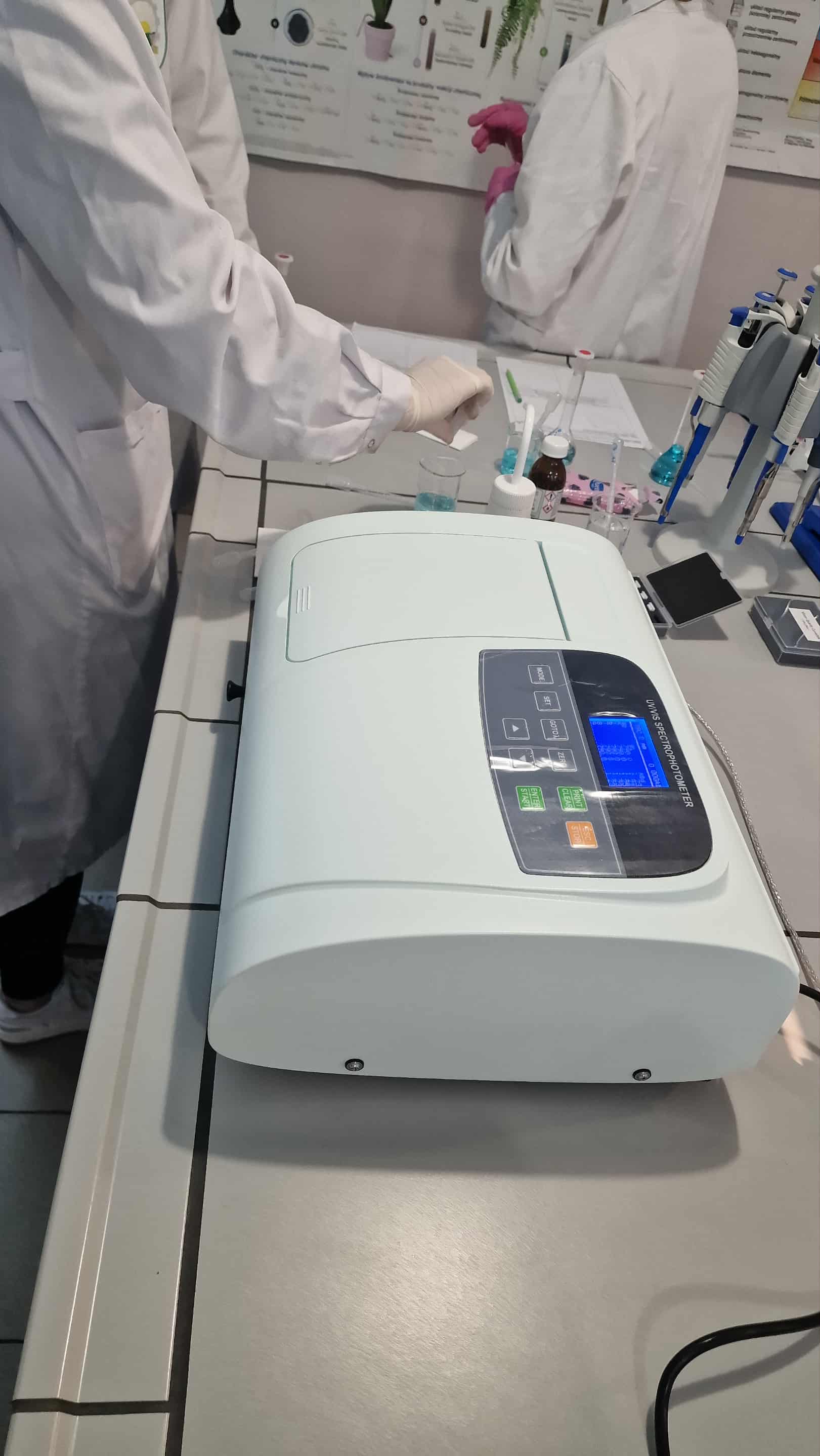 W ramach zajęć praktycznych z analizy instrumentalnej uczniowie klasy piątej kształcący się w zawodzie technik analityk mieli okazję zapoznać się z zasadą działania oraz obsługą spektrofotometru UV-Vis – nowoczesnego urządzenia wykorzystywanego w laboratoriach chemicznych, środowiskowych i przemysłowych, który został zakupiony w ramach projektu „Zostań zawodowcem!"- wsparcie kształcenia zawodowego i ustawicznego w Powiecie Gostyńskim.