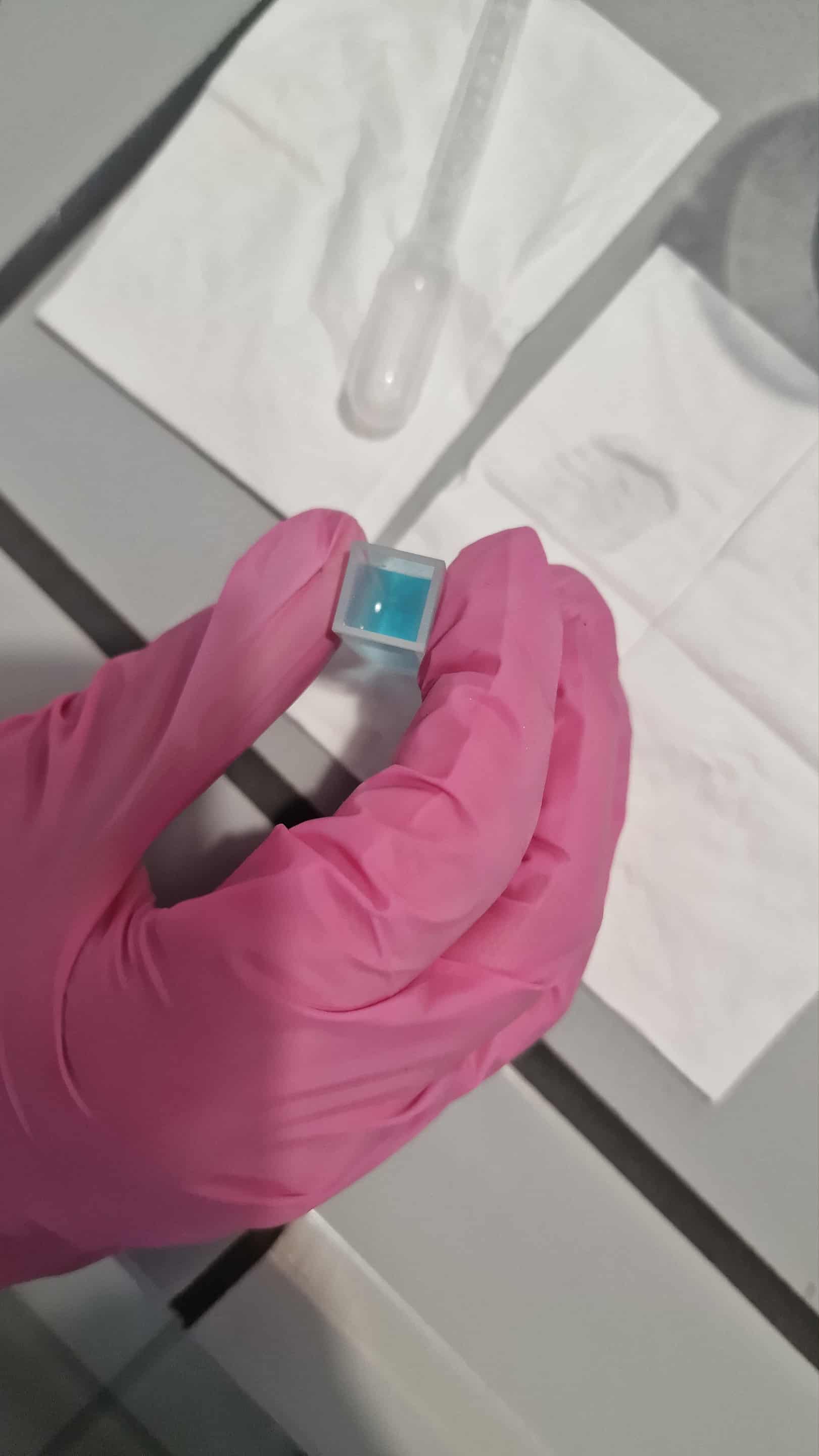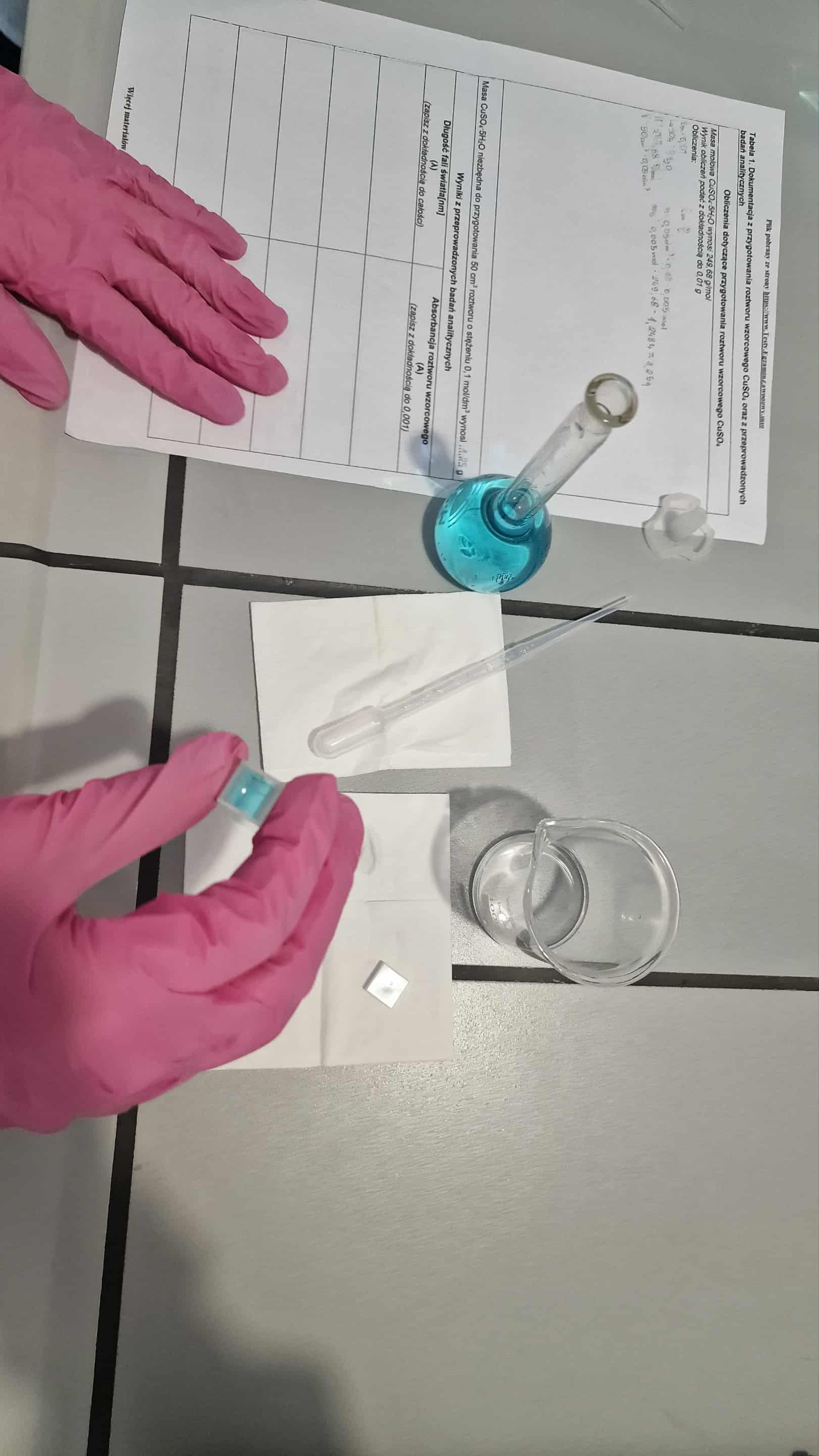 Podczas zajęć uczniowie wykonywali pomiary spektrofotometryczne roztworu wzorcowego siarczanu miedzi(II) – CuSO₄. Celem ćwiczenia było określenie zależności pomiędzy pochłanianiem promieniowania (absorbancją) a stężeniem roztworu zgodnie z prawem Lamberta-Beera.