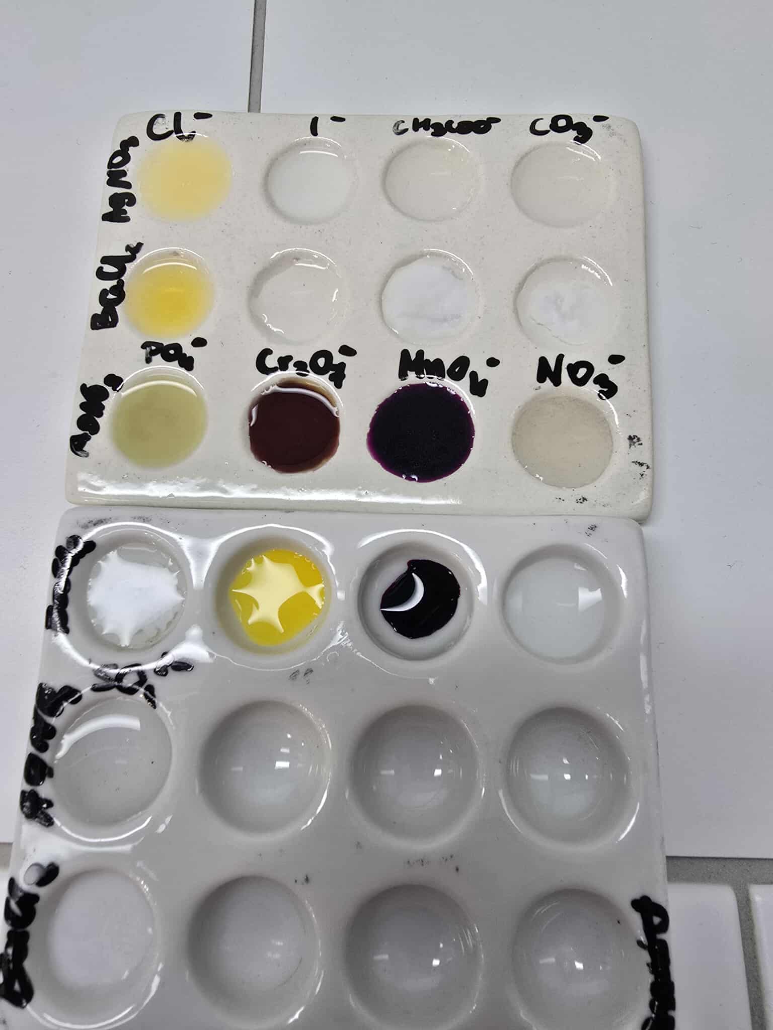 Podczas ćwiczeń laboratoryjnych uczniowie uczą się identyfikować poszczególne jony dodatnie i ujemne na podstawie ich charakterystycznych reakcji chemicznych. Rozpoznają m.in. kationy np., Na+, Ca2+ , Ba 2+, itd. oraz aniony Cl-, Br-, SO42- itd. , wykorzystując do tego odpowiednie odczynniki grupowe. W trakcie doświadczeń obserwują zmiany barwy roztworów, powstawanie osadów, co pozwala im prawidłowo określić skład badanych próbek.