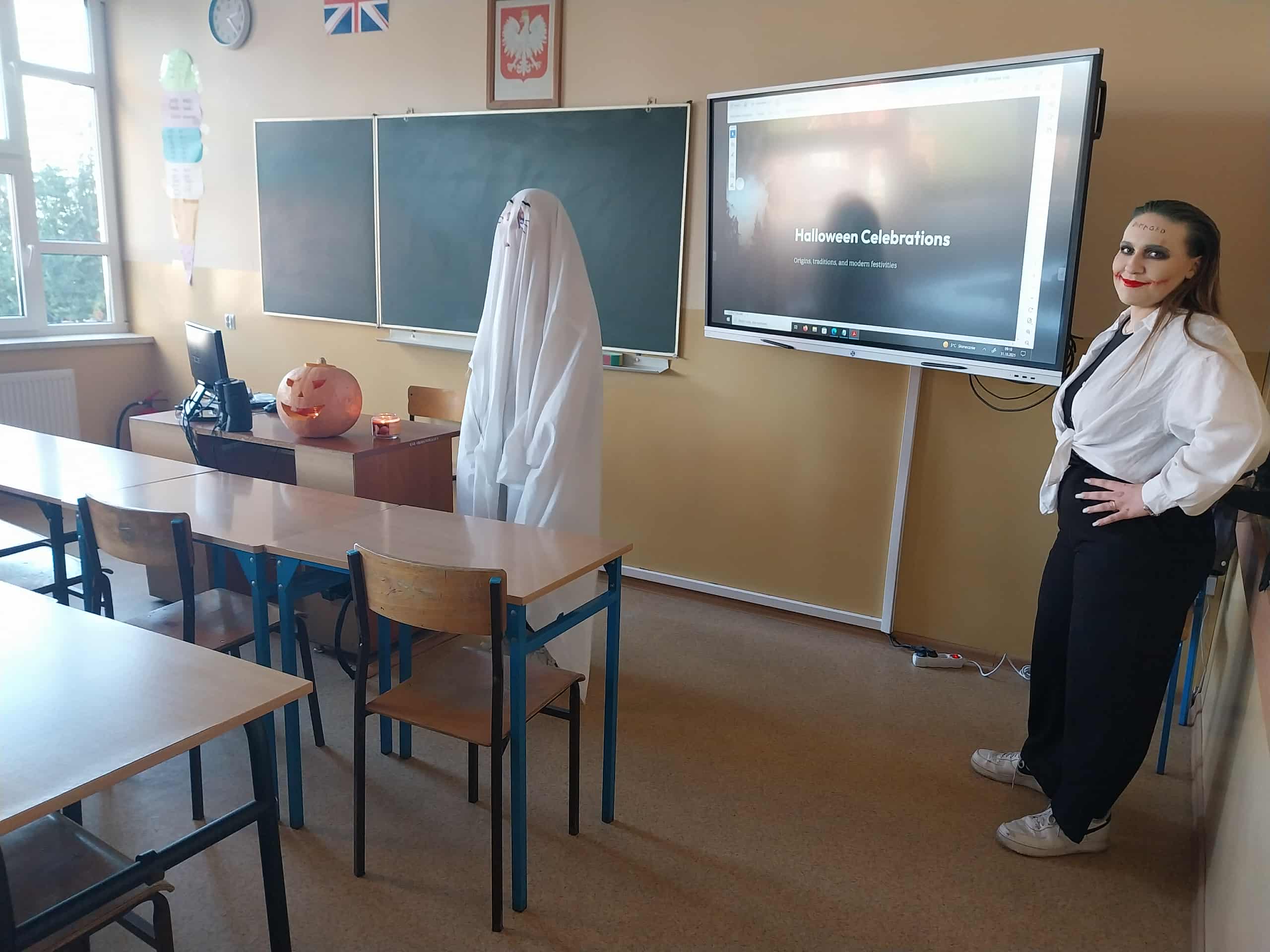 W tym roku święto Halloween w naszej szkole miało wyjątkowy charakter. Zamiast tradycyjnych zabaw i konkursów, uczniowie podczas lekcji języka angielskiego sami wcielili się w rolę nauczycieli! Przygotowali ciekawe prezentacje, quizy oraz różnorodne zadania w języku angielskim, dzięki czemu mogli w praktyce rozwijać swoje umiejętności komunikacyjne i pewność siebie w mówieniu.