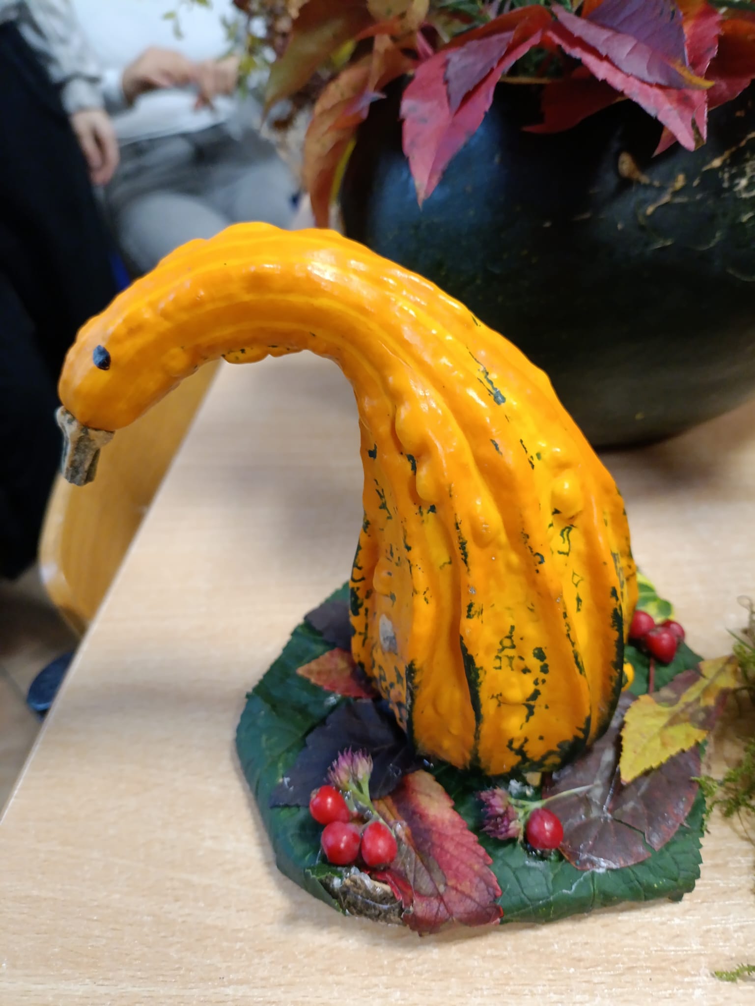 Uczniowie podczas zajęć odkryli jak w prosty sposób wydobyć piękno liści, kwiatów, owoców, traw i innych materiałów zebranych w szkolnym parku. A to wszystko stało się za sprawą dyni jako bazy do tworzenia kompozycji.