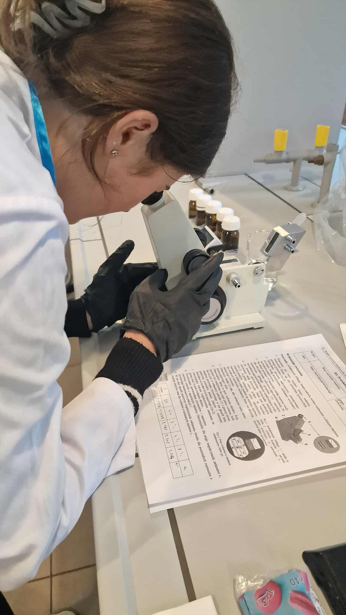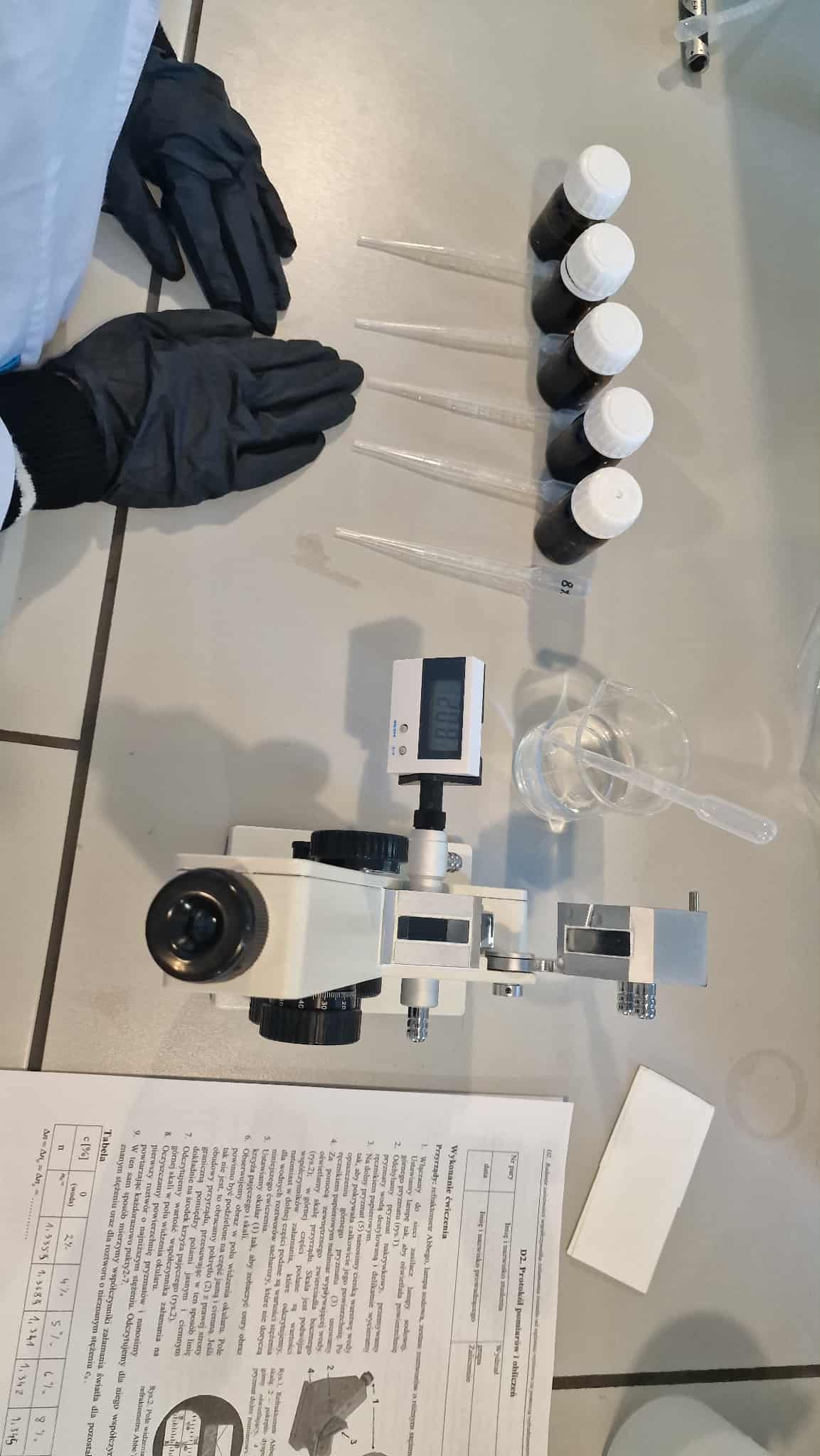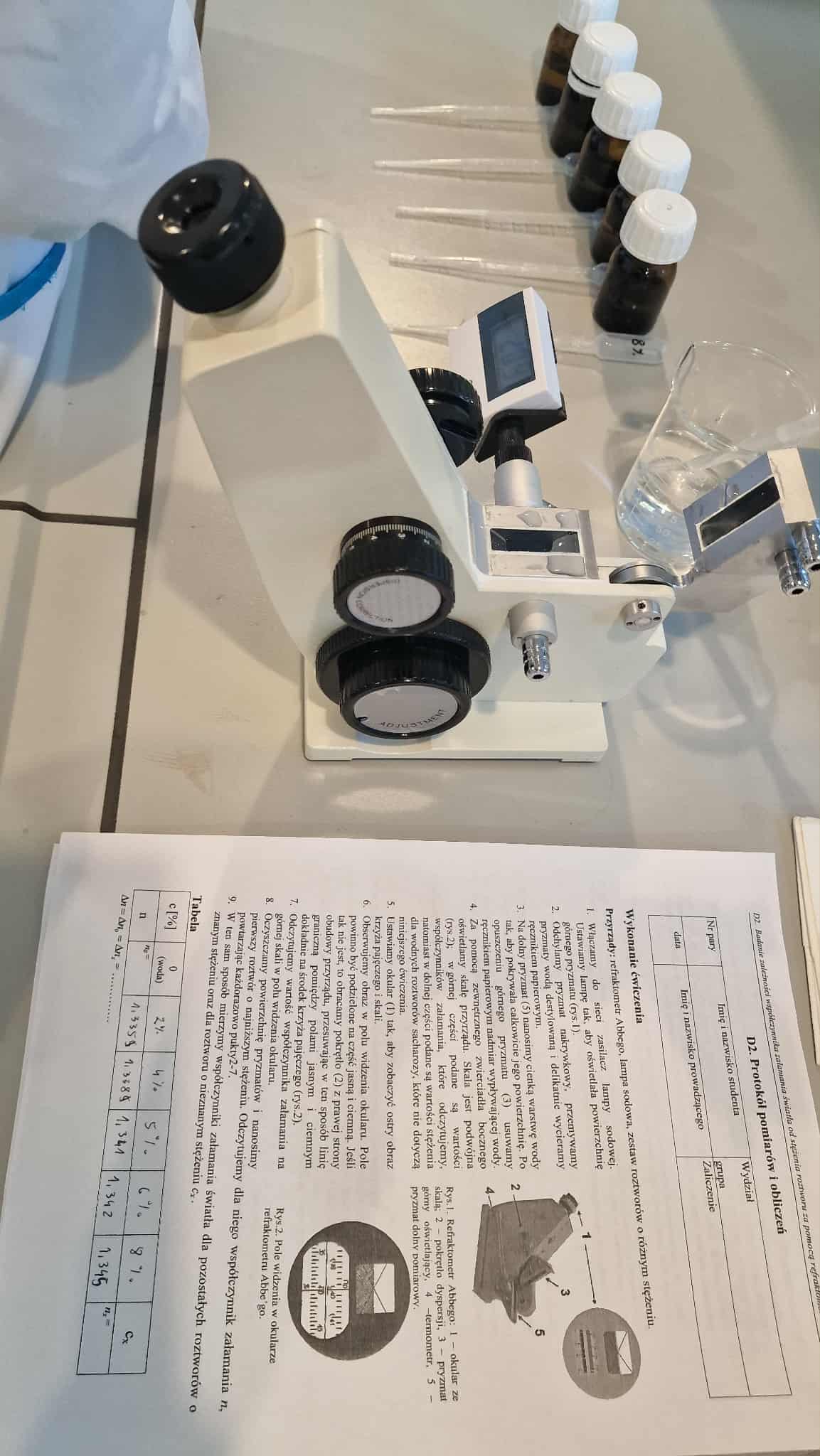 W ramach zajęć praktycznych uczniowie klasy piątej przeprowadzili ciekawe doświadczenie z wykorzystaniem refraktometru Abbego. Celem badania było sprawdzenie, jak zmienia się współczynnik załamania światła w zależności od stężenia roztworu glukozy. Refraktometr pozwala dokładnie zmierzyć, jak bardzo światło zmienia kierunek przechodząc przez ciecz – dzięki temu można określić, jak „gęsty optycznie” jest roztwór.