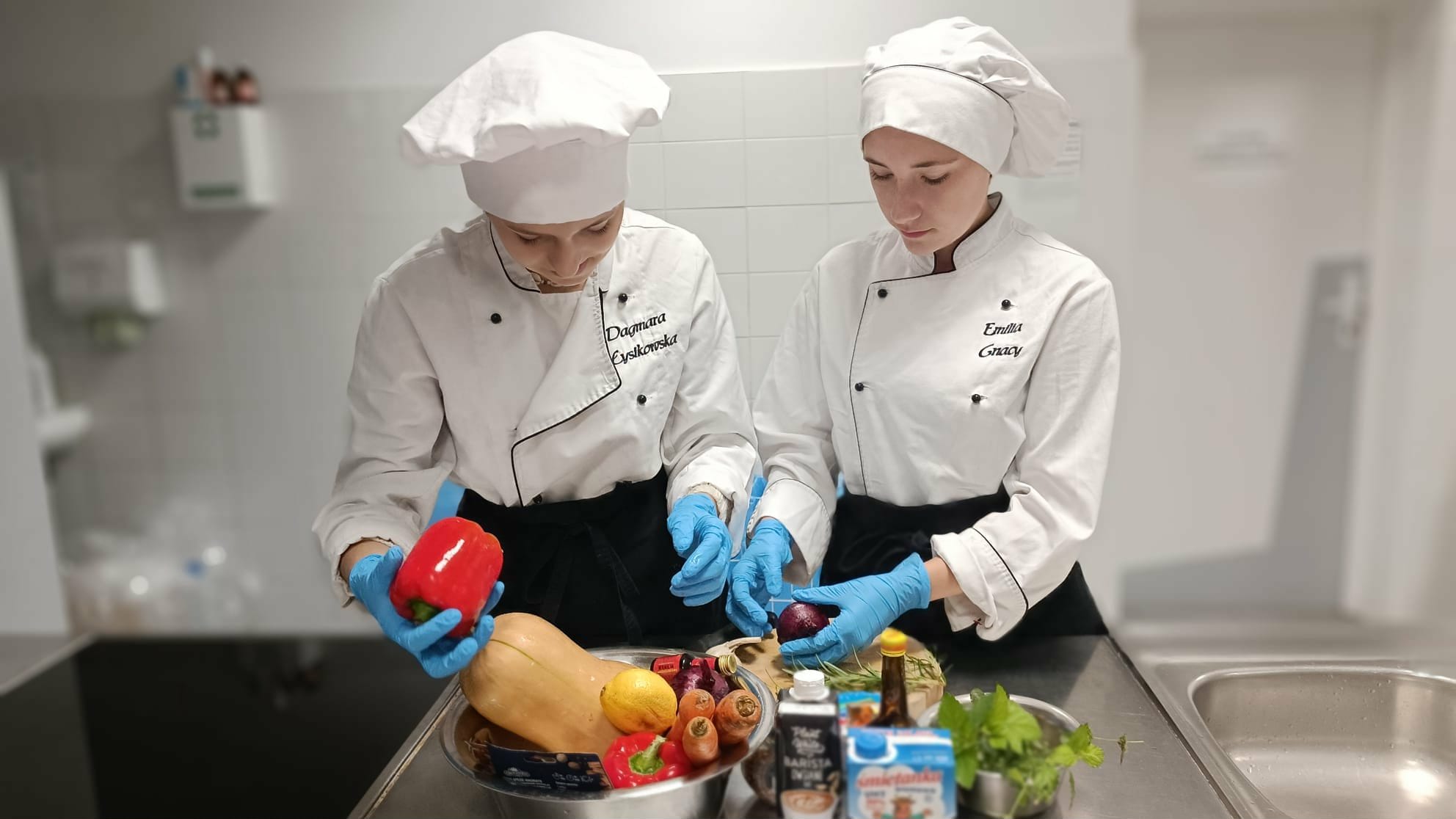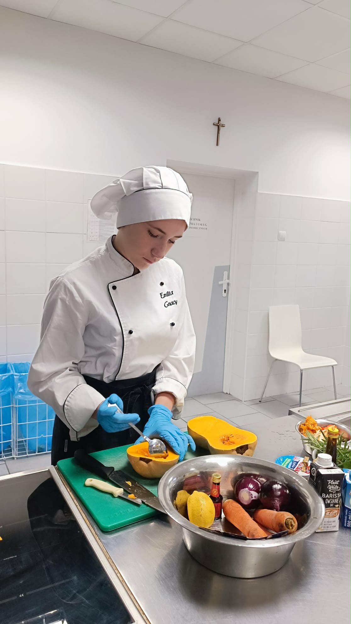 Podczas zajęć praktycznych uczniowie kształcący się w zawodzie technik żywienia i usług gastronomicznych, zamienili szkolną kuchnię w prawdziwe kulinarne laboratorium smaku. Tematem przewodnim była zupa krem z dyni oraz klasyczny włoski deser panna cotta.