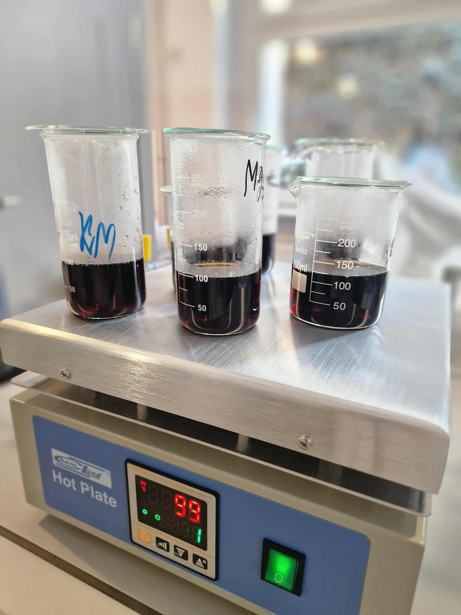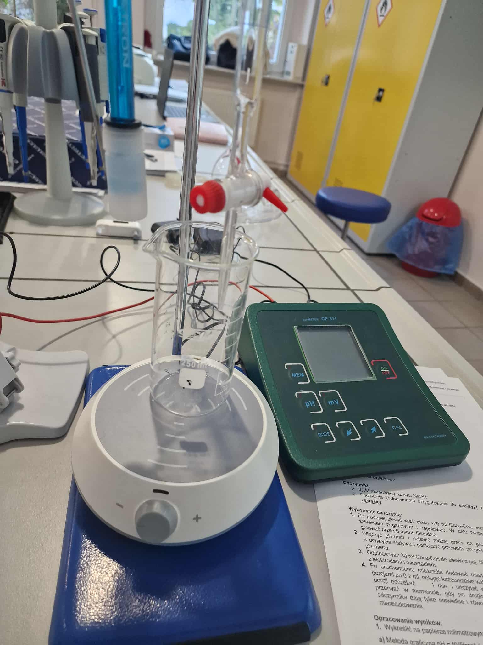 Do oznaczenia wykorzystali metodę potencjometryczną. Podczas ćwiczenia uczniowie przygotowali próbkę napoju, przygotowali odpowiedni sprzęt i odczynniki chemiczne a następnie wykonali miareczkowanie roztworem NaOH, obserwując zmiany pH w trakcie miareczkowania. W przypadku miareczkowania kwasów wieloprotonowych występują na krzywej miareczkowania dwa skoki.