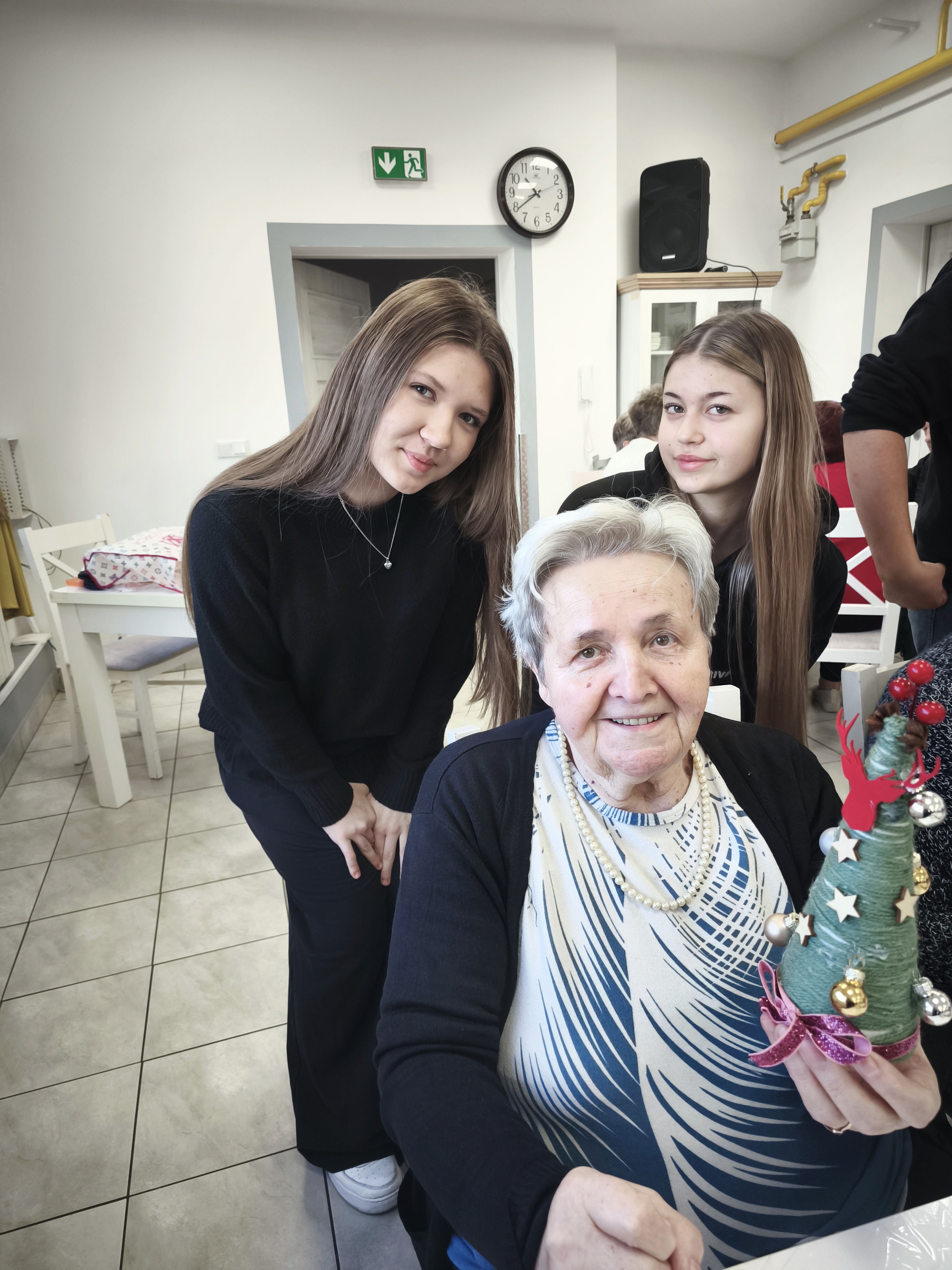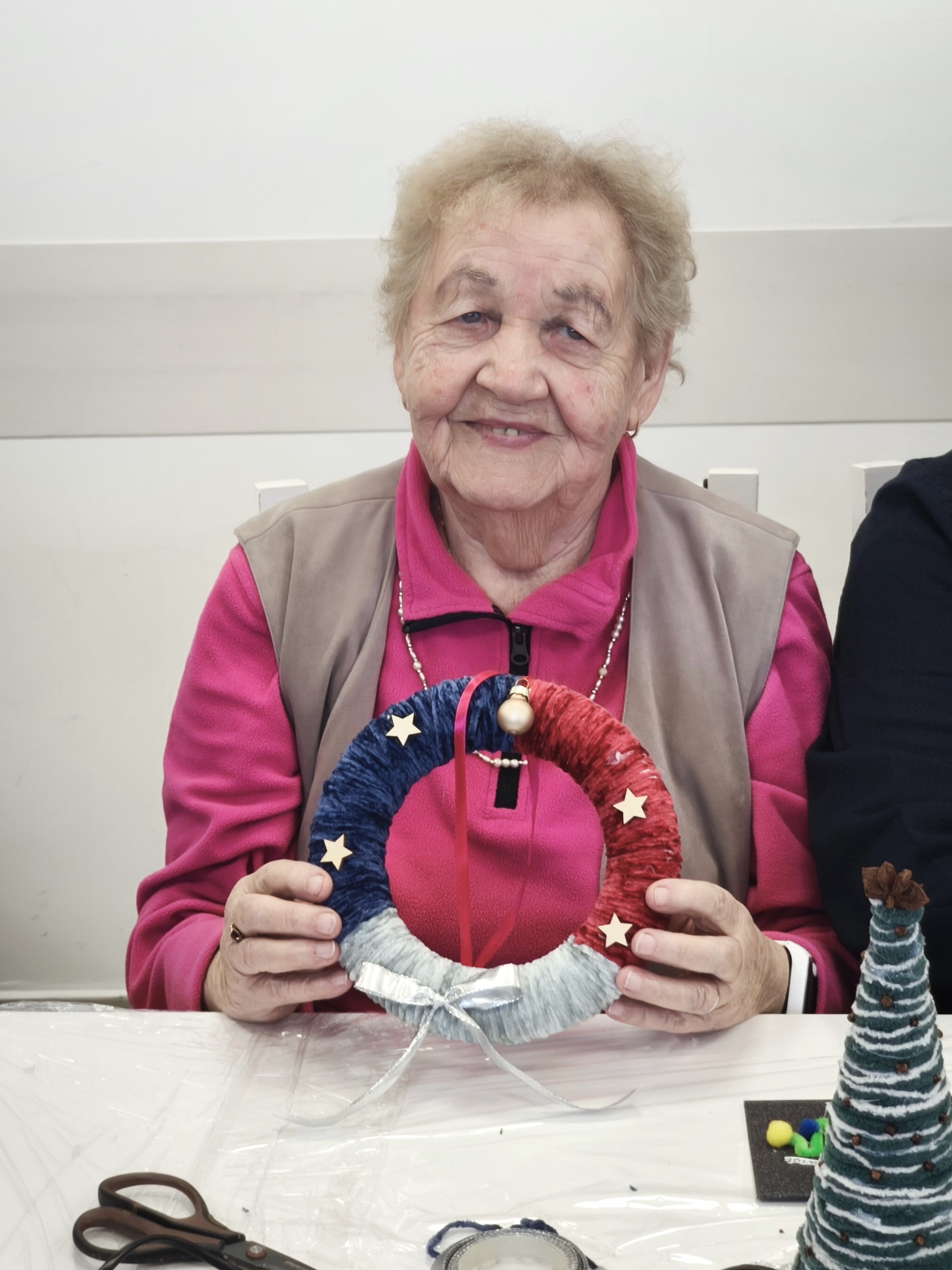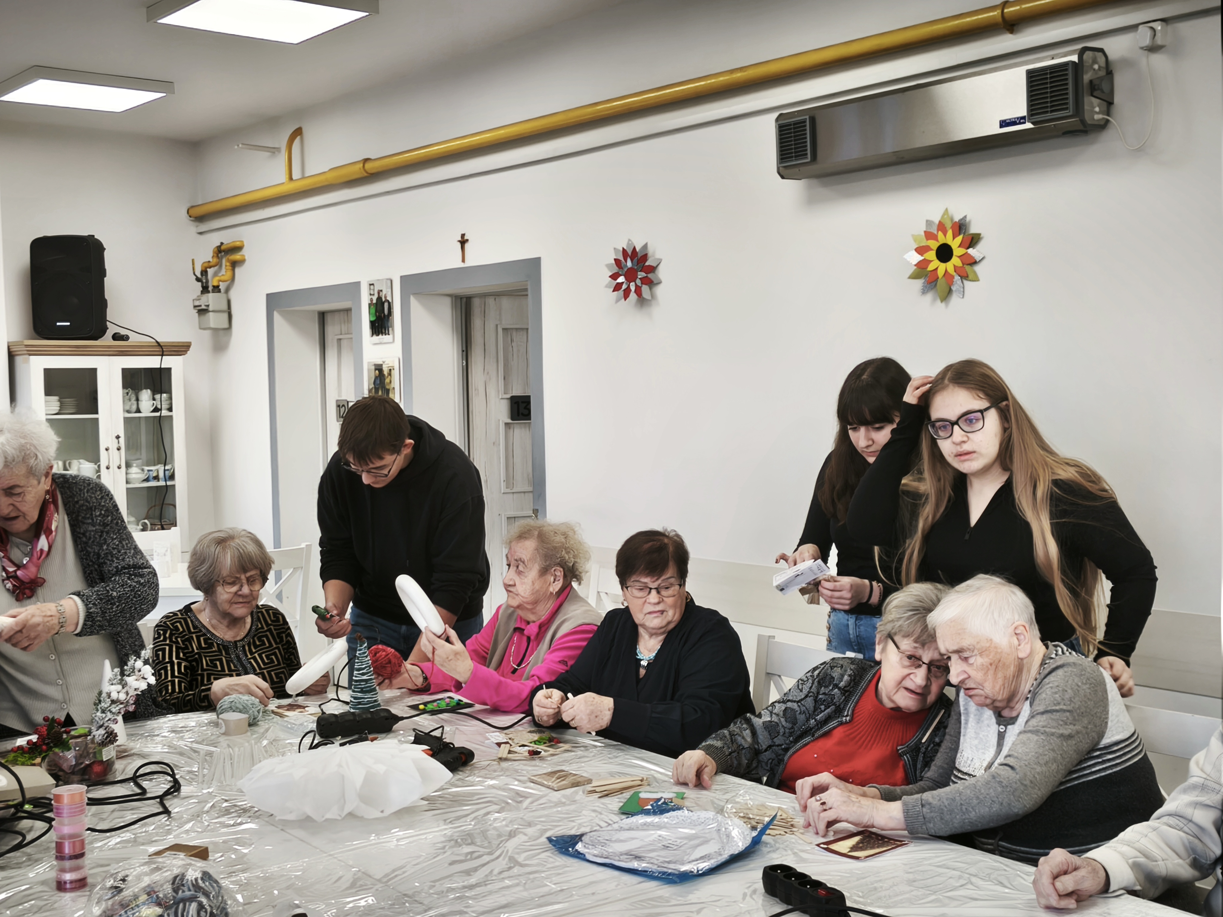 Po uroczystym przekazaniu życzeń przyszedł czas na wspólne działanie twórcze. Kolejnym etapem spotkania były warsztaty plastyczno-techniczne, podczas których młodzież wraz z seniorami wykonywała ozdoby bożonarodzeniowe. Były to chwile pełne rozmów, śmiechu i wymiany doświadczeń między pokoleniami. Seniorzy z entuzjazmem włączyli się w pracę, a młodzież wykazała się niezwykłą empatią, cierpliwością oraz zaangażowaniem.