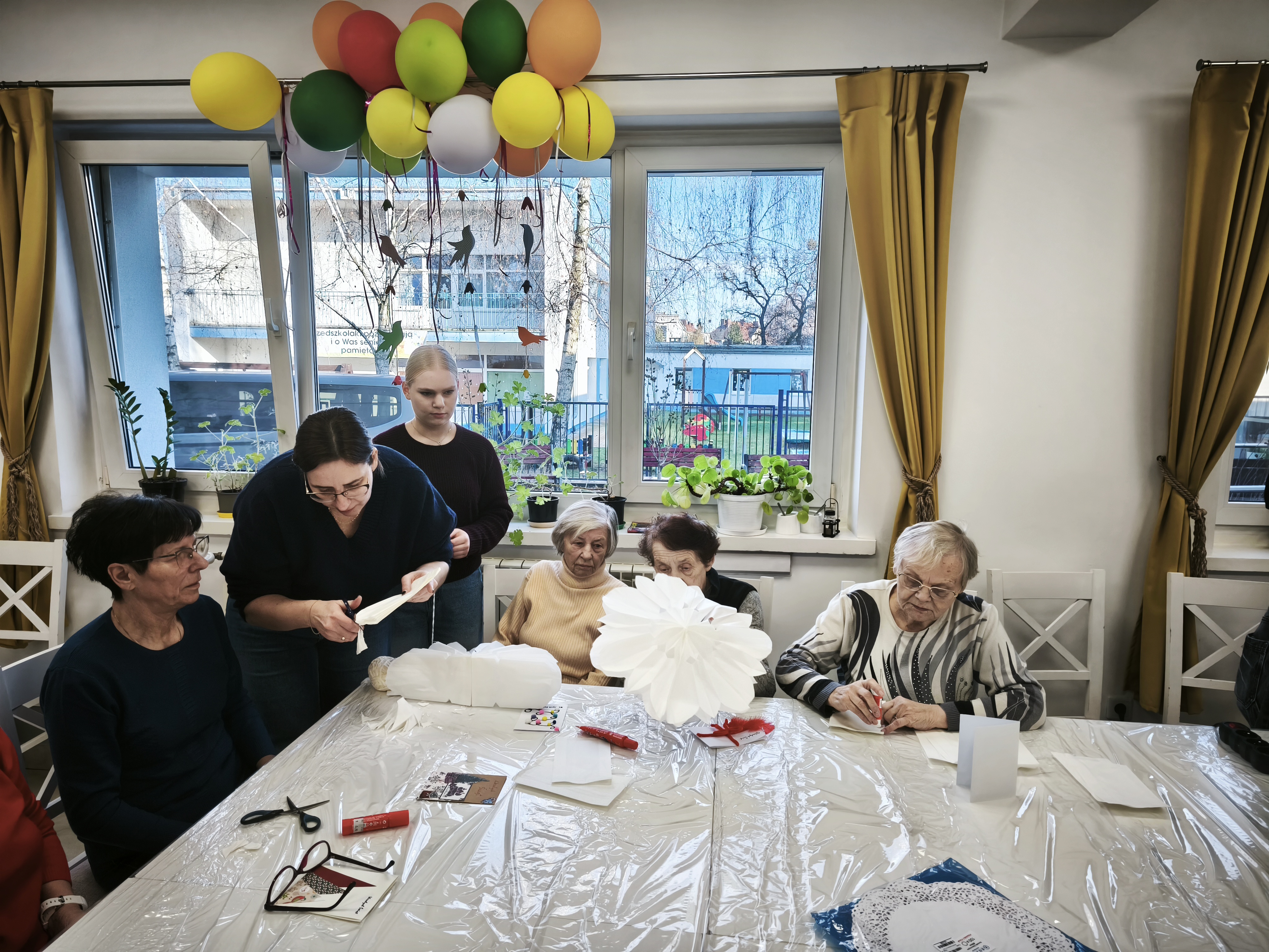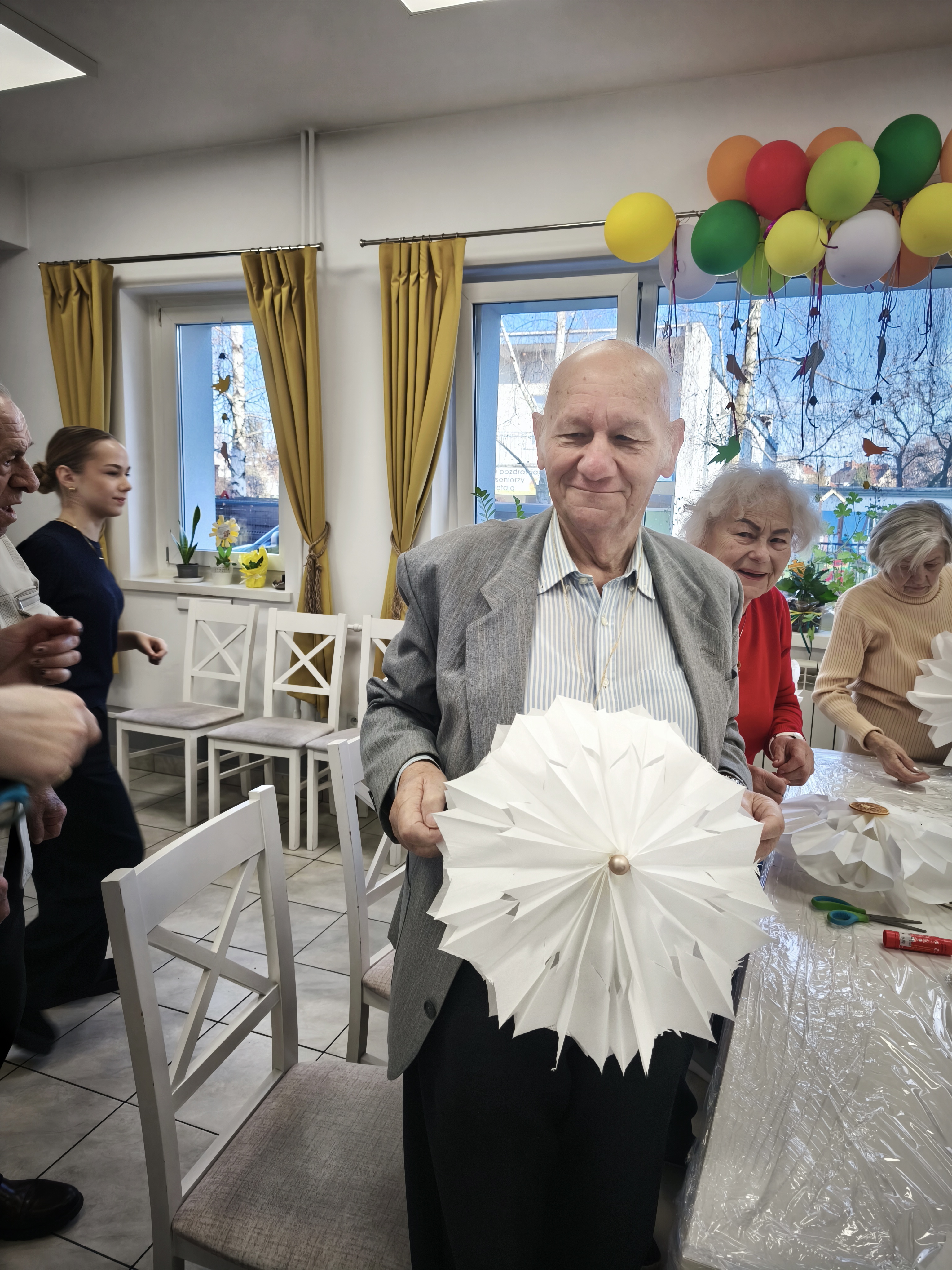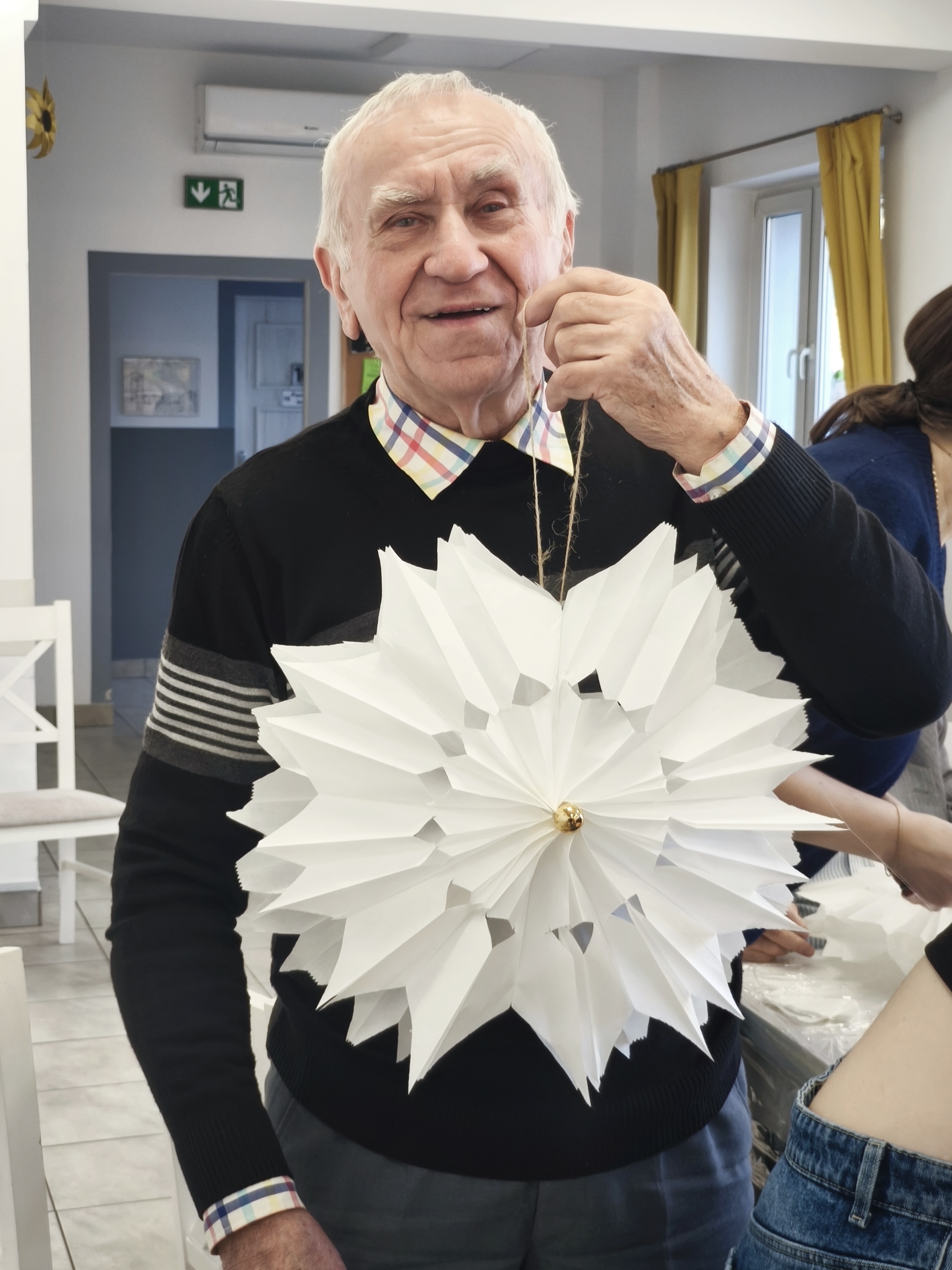 Po uroczystym przekazaniu życzeń przyszedł czas na wspólne działanie twórcze. Kolejnym etapem spotkania były warsztaty plastyczno-techniczne, podczas których młodzież wraz z seniorami wykonywała ozdoby bożonarodzeniowe. Były to chwile pełne rozmów, śmiechu i wymiany doświadczeń między pokoleniami. Seniorzy z entuzjazmem włączyli się w pracę, a młodzież wykazała się niezwykłą empatią, cierpliwością oraz zaangażowaniem.