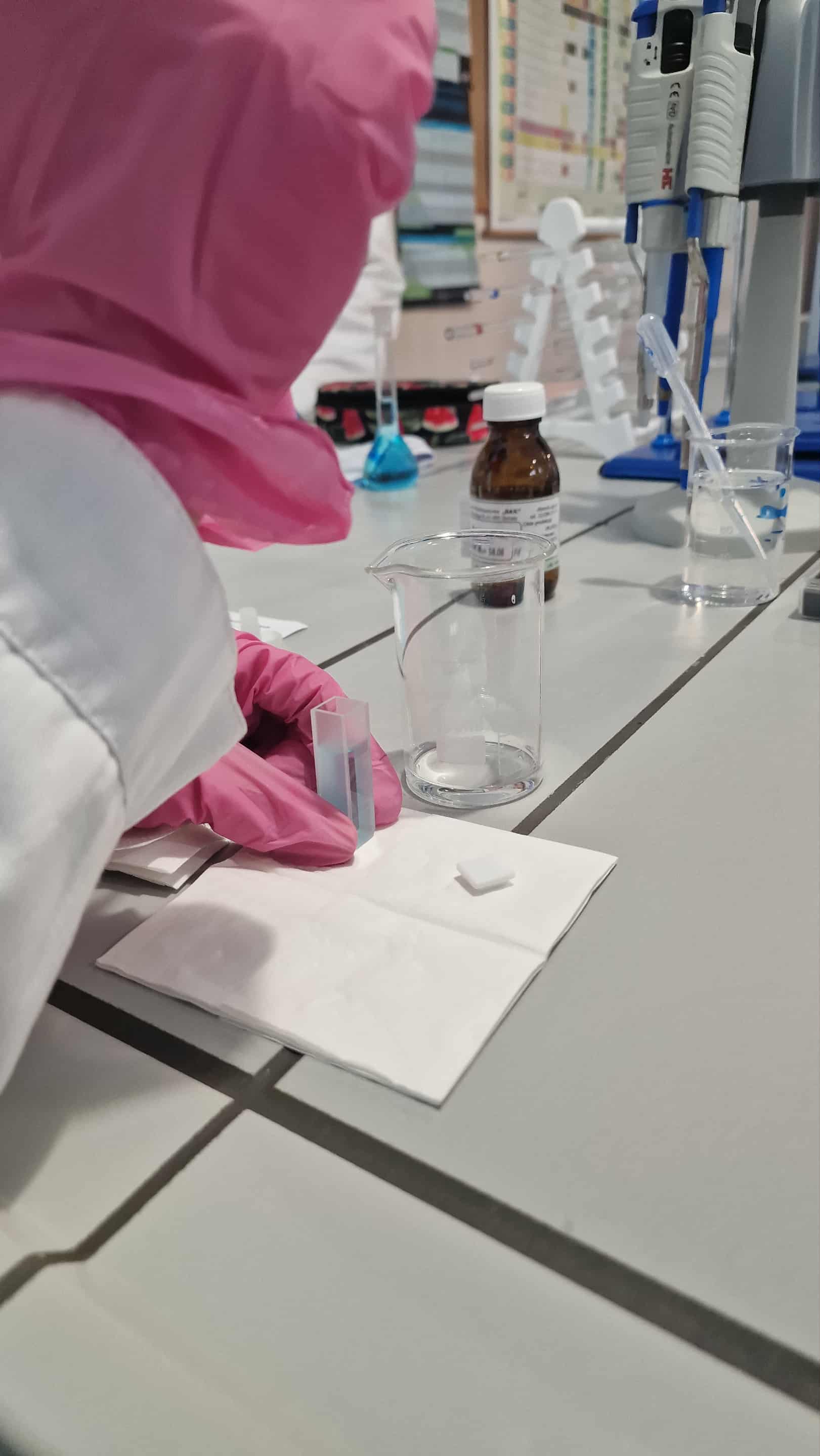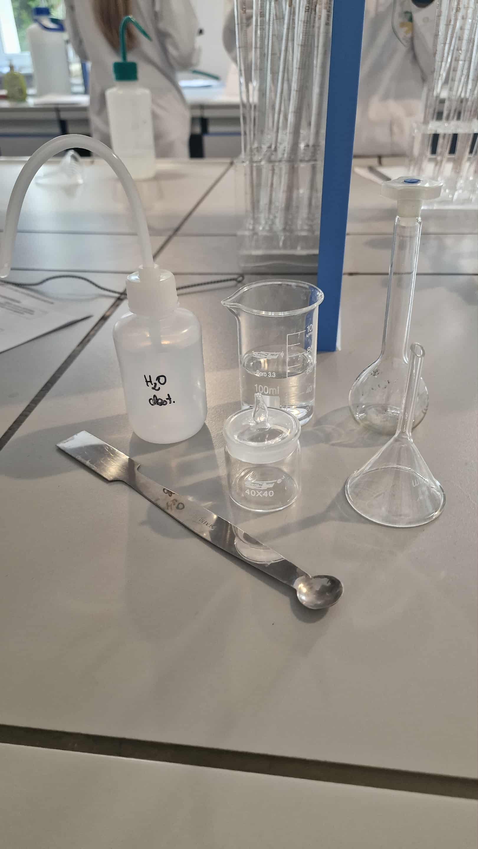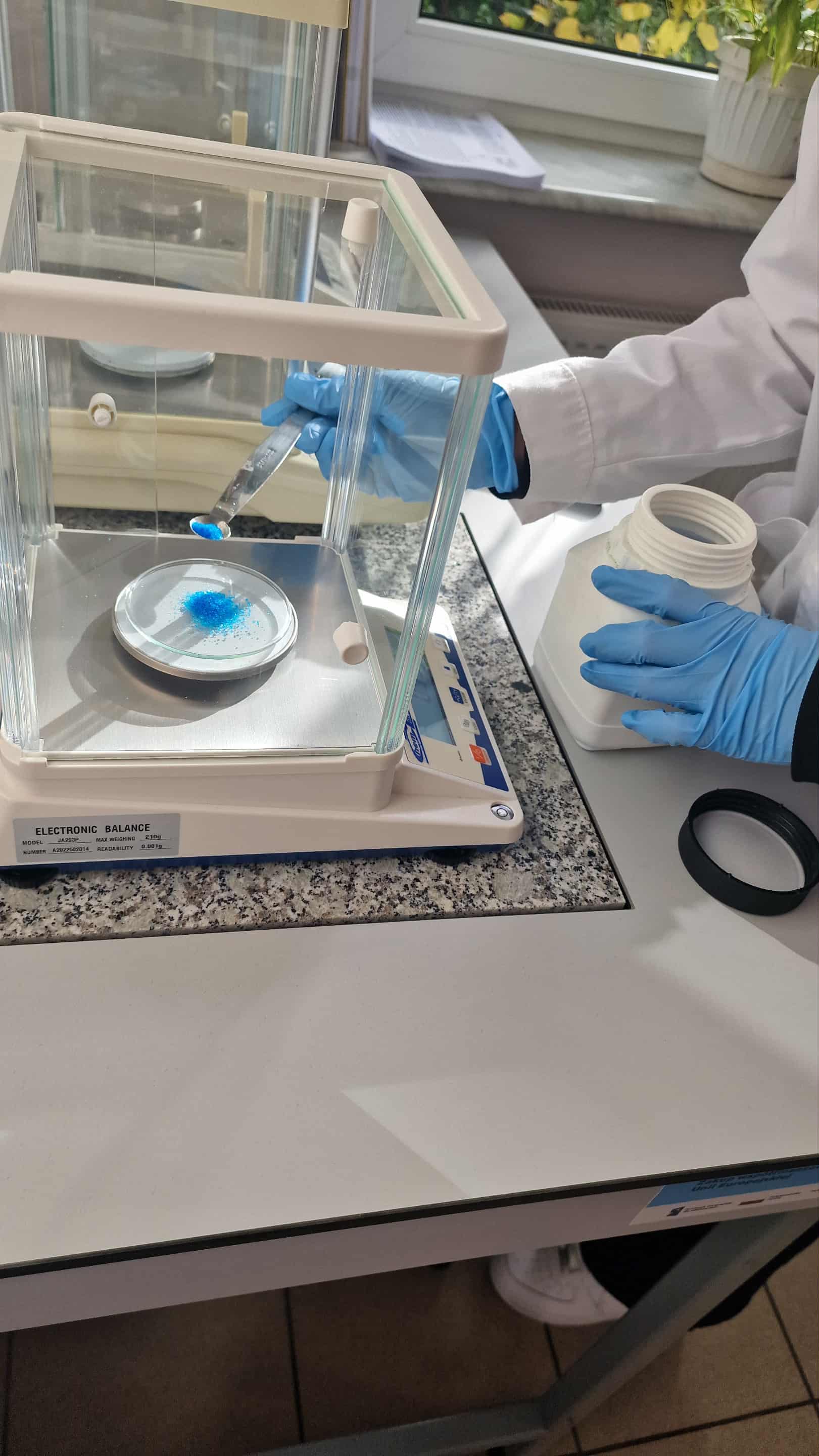 Podczas zajęć uczniowie wykonywali pomiary spektrofotometryczne roztworu wzorcowego siarczanu miedzi(II) – CuSO₄. Celem ćwiczenia było określenie zależności pomiędzy pochłanianiem promieniowania (absorbancją) a stężeniem roztworu zgodnie z prawem Lamberta-Beera.