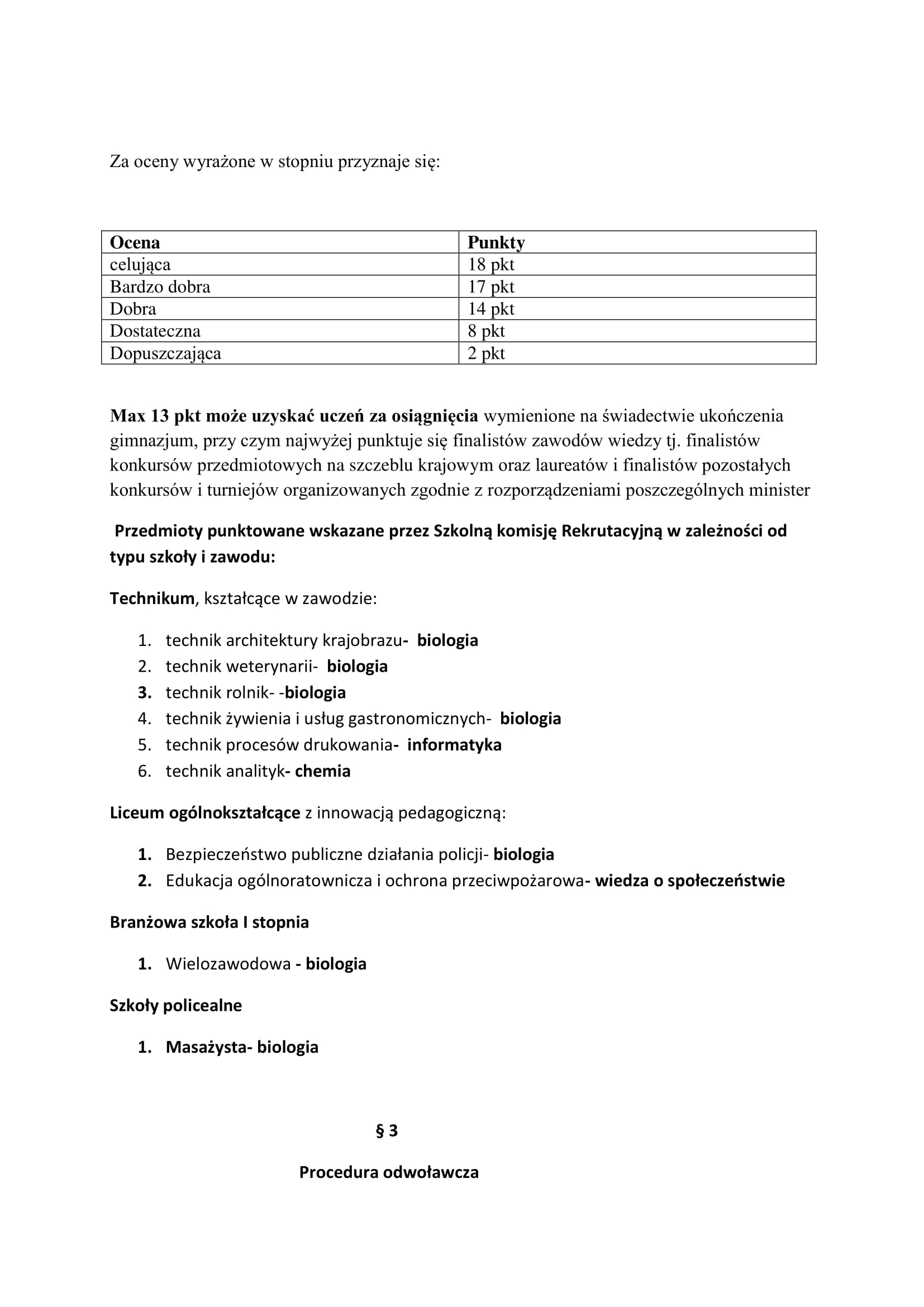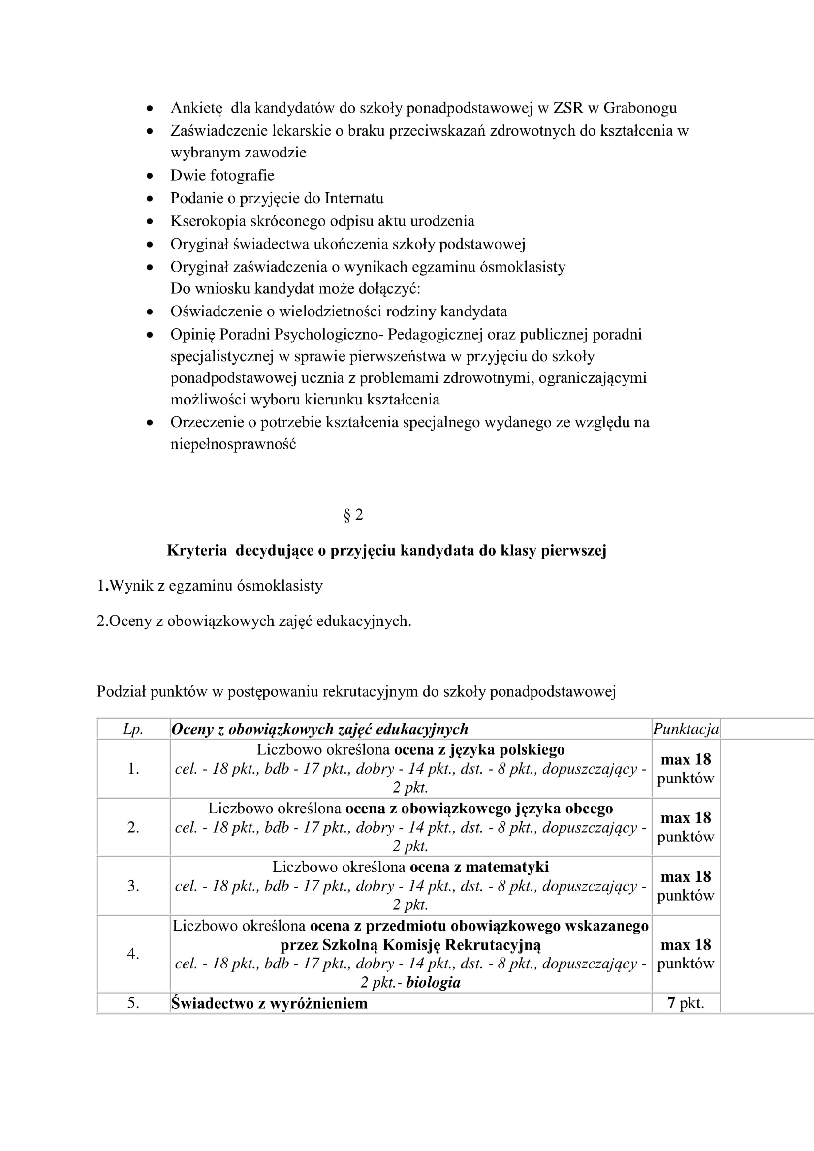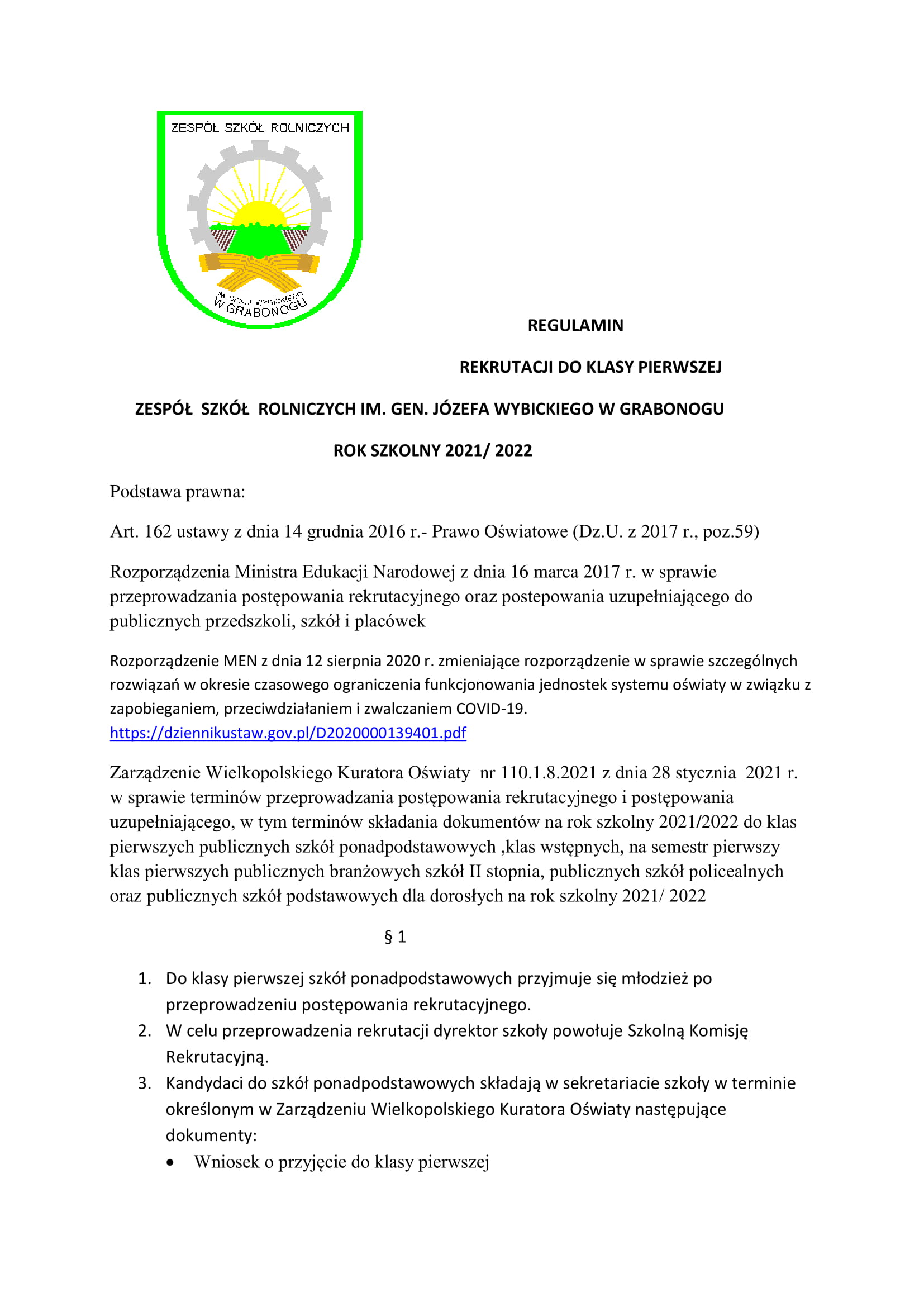 Regulamin rekrutacji do klas pierwszych Zespołu Szkół Rolniczych im. gen. Józefa Wybickiego w Grabonogu na rok szkolny 2021/2022.