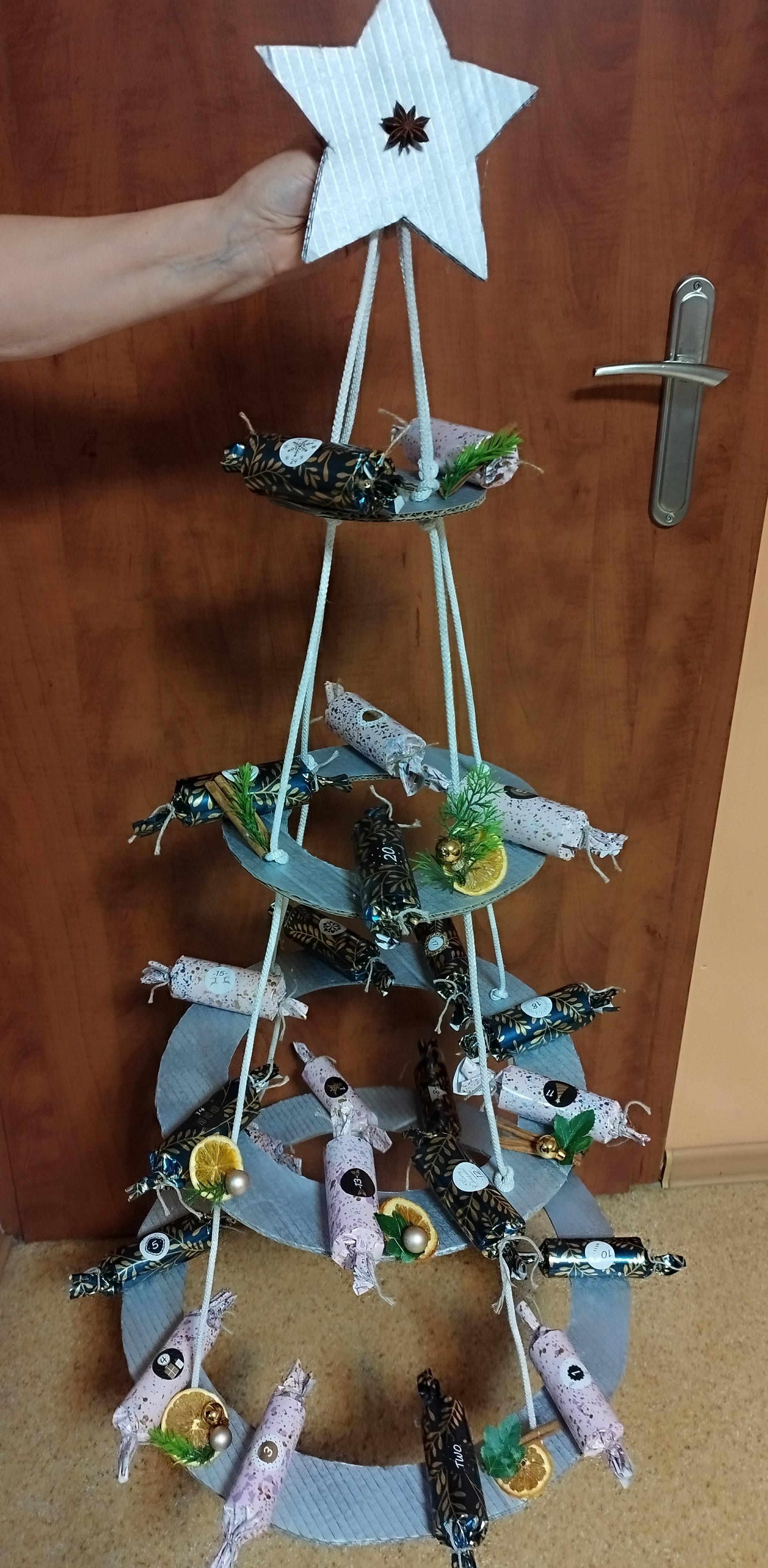 Centralnym elementem kalendarza została wykonana przez młodzież dekoracyjna choinka –. to właśnie na niej umieszczono dwadzieścia cztery pudełka z numerami poszczególnych dni grudnia. Każde z nich zostało misternie ozdobione, tak aby stanowiło nie tylko tradycyjny element adwentowego odliczania, ale również unikatową dekorację.