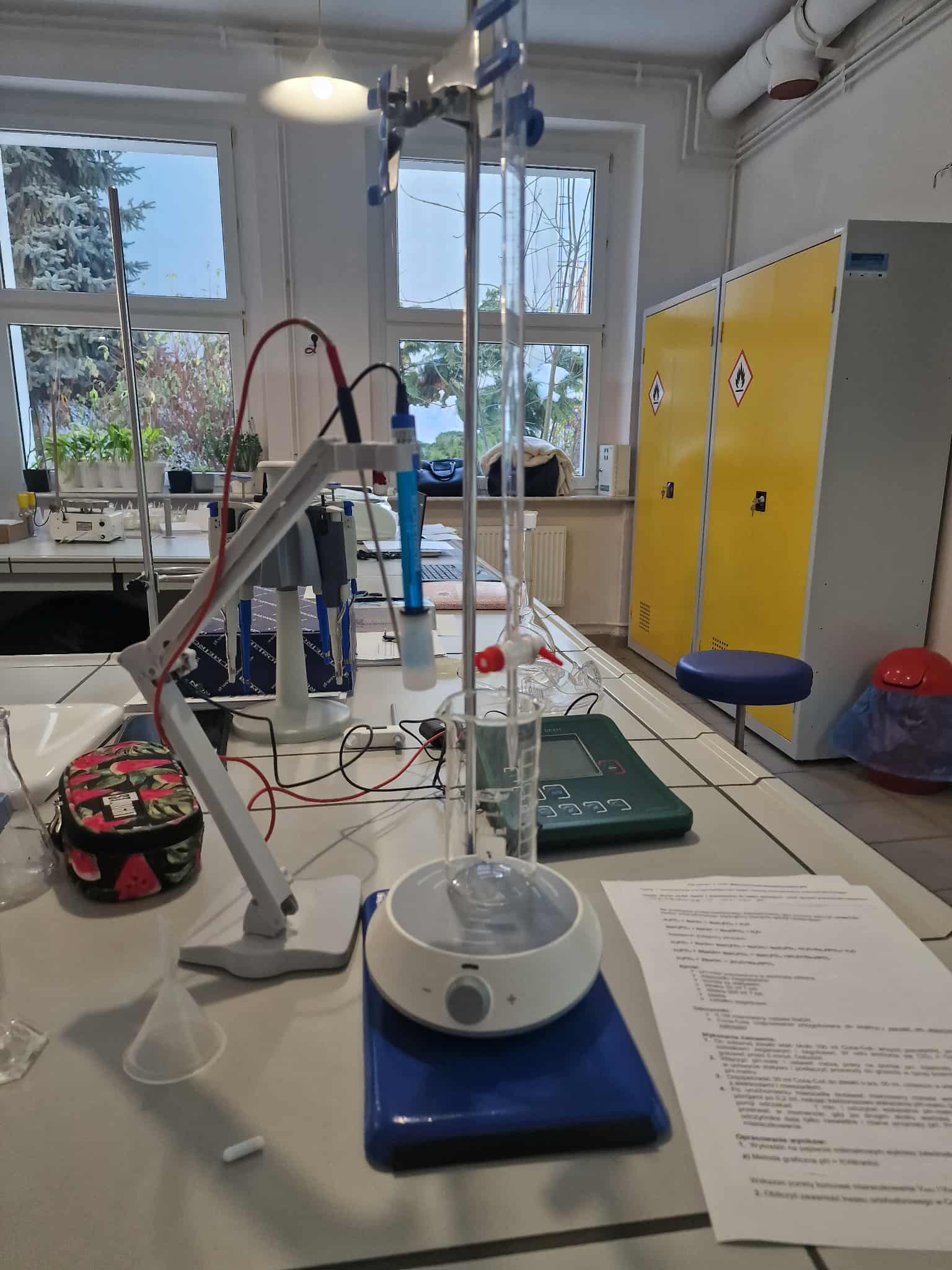 Do oznaczenia wykorzystali metodę potencjometryczną. Podczas ćwiczenia uczniowie przygotowali próbkę napoju, przygotowali odpowiedni sprzęt i odczynniki chemiczne a następnie wykonali miareczkowanie roztworem NaOH, obserwując zmiany pH w trakcie miareczkowania. W przypadku miareczkowania kwasów wieloprotonowych występują na krzywej miareczkowania dwa skoki.
