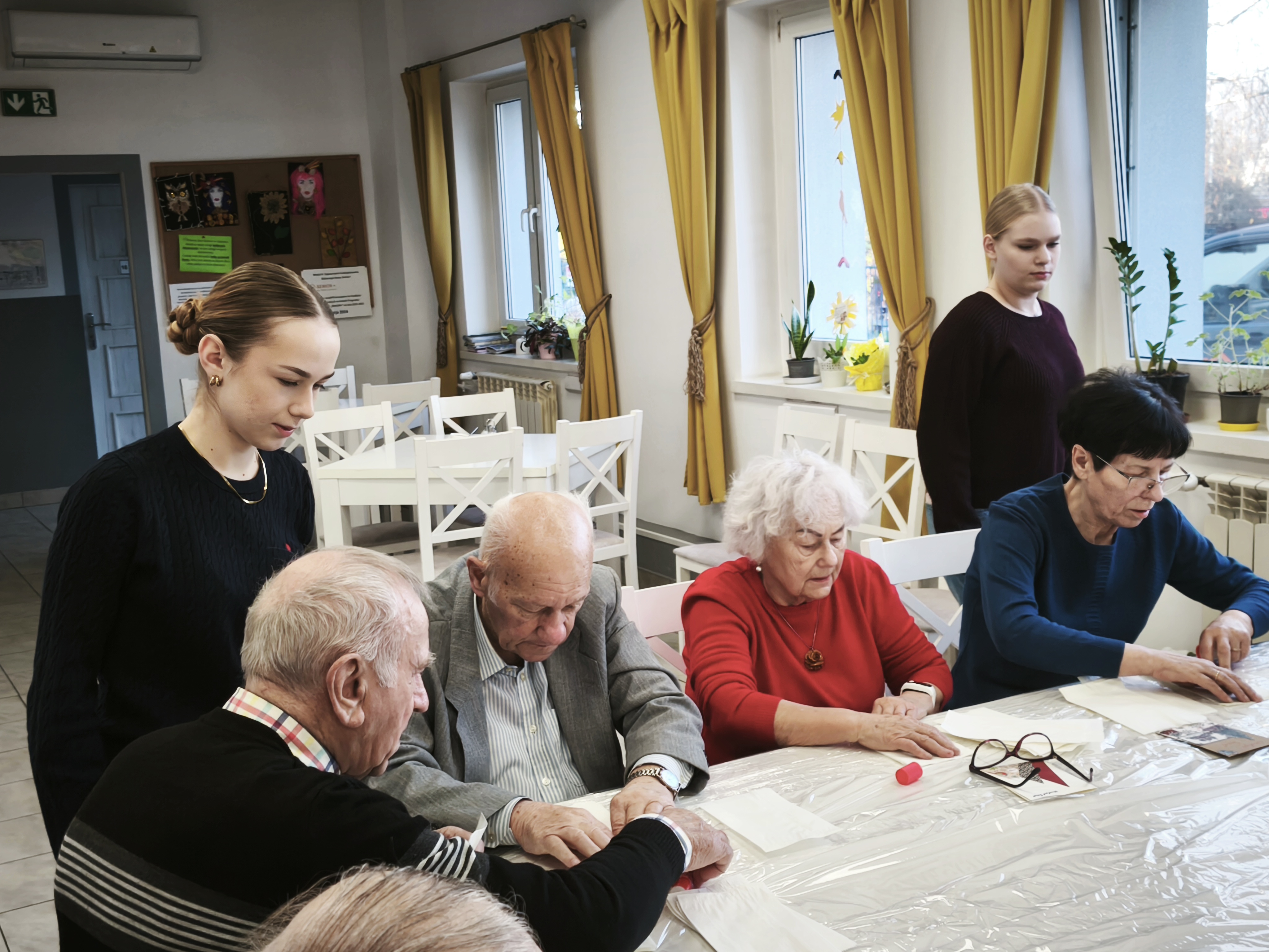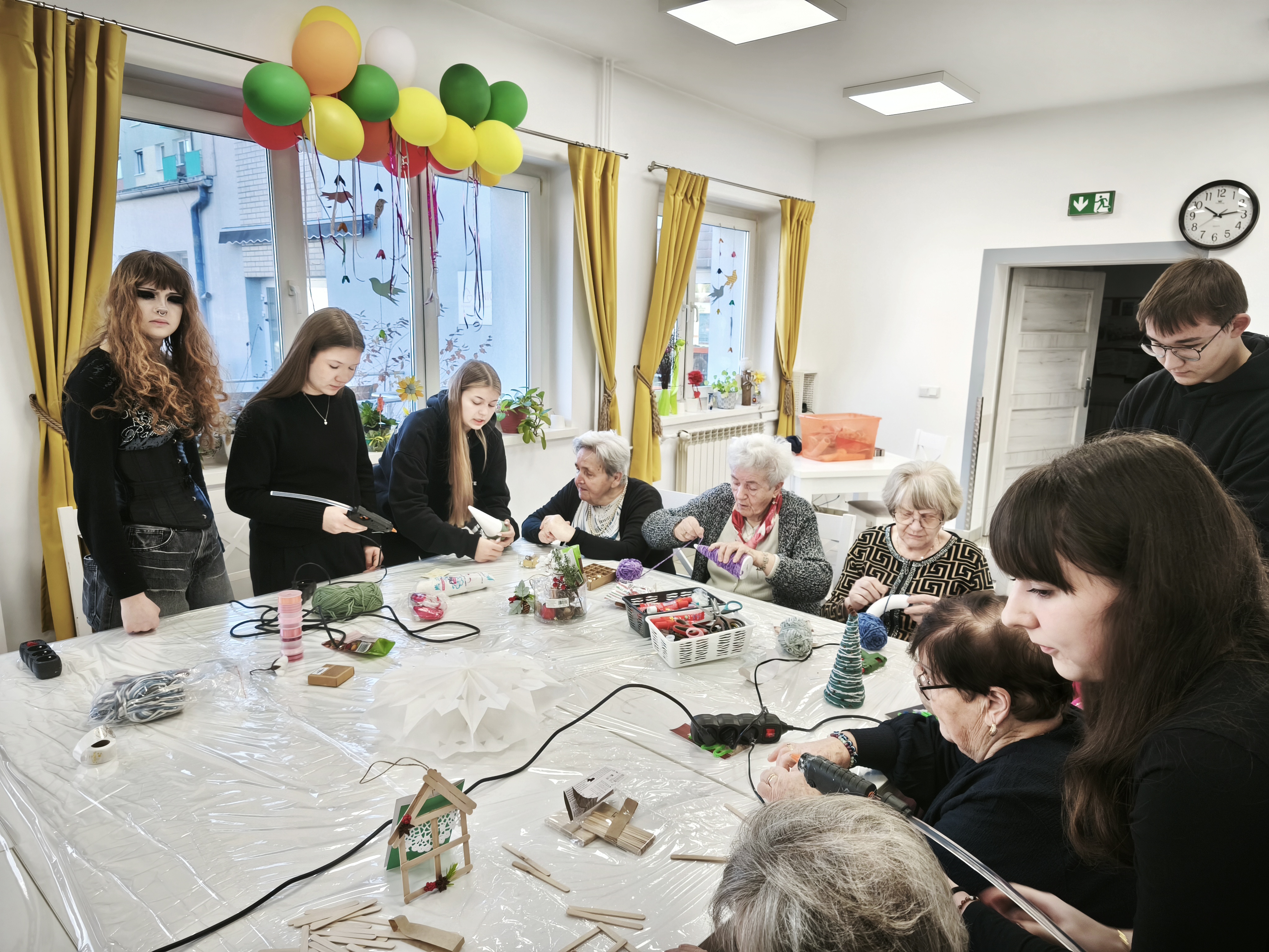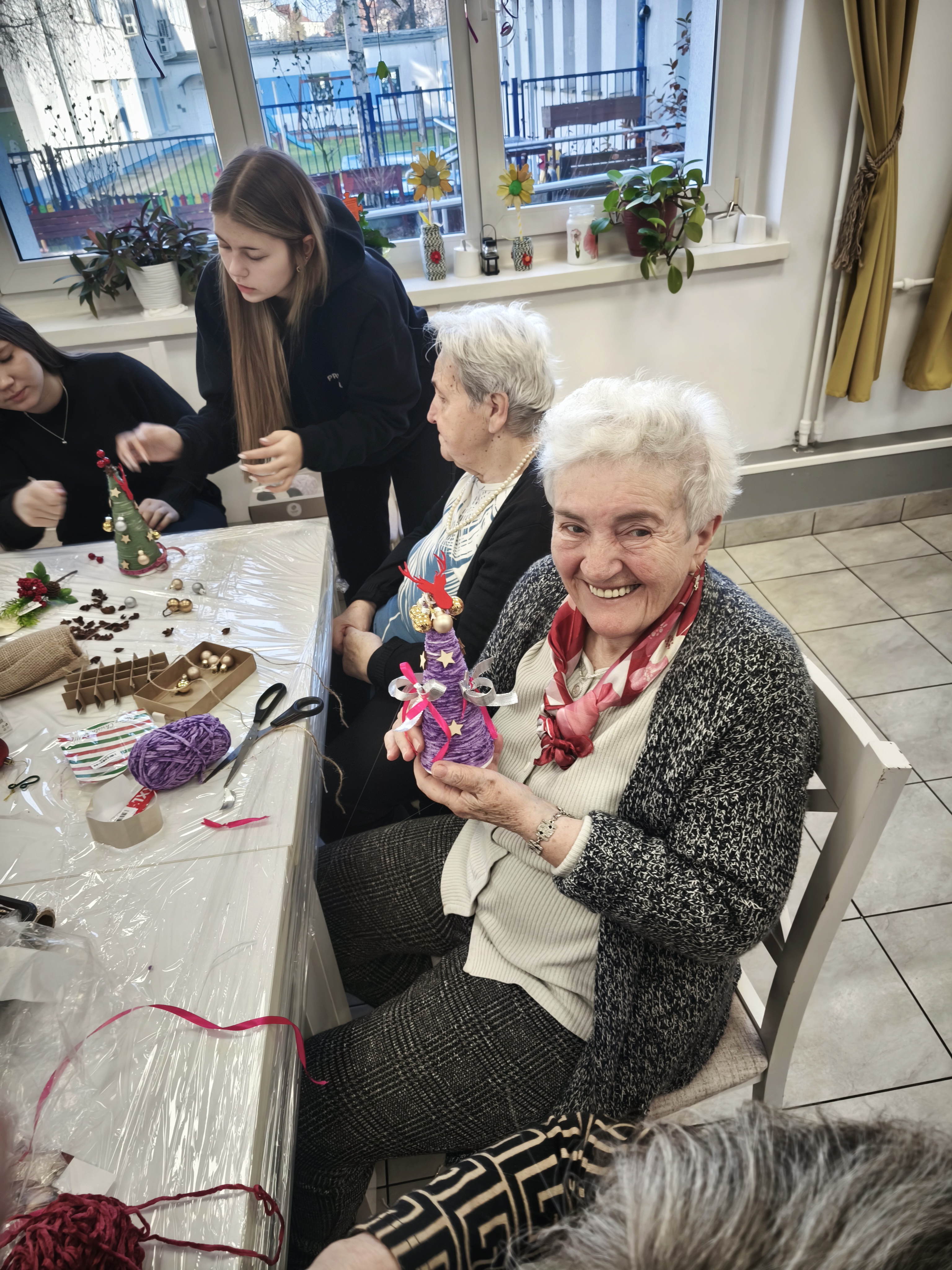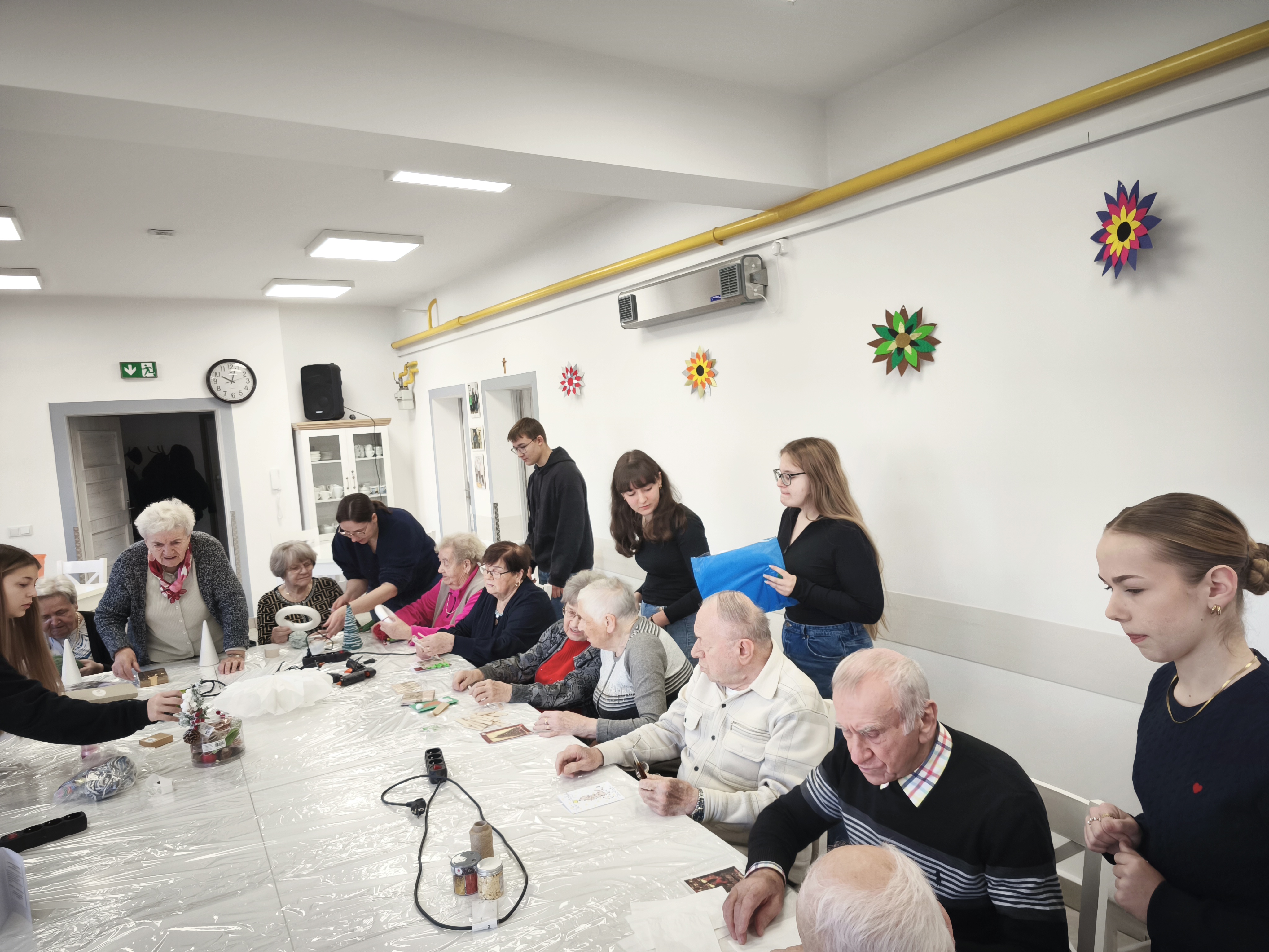 Po uroczystym przekazaniu życzeń przyszedł czas na wspólne działanie twórcze. Kolejnym etapem spotkania były warsztaty plastyczno-techniczne, podczas których młodzież wraz z seniorami wykonywała ozdoby bożonarodzeniowe. Były to chwile pełne rozmów, śmiechu i wymiany doświadczeń między pokoleniami. Seniorzy z entuzjazmem włączyli się w pracę, a młodzież wykazała się niezwykłą empatią, cierpliwością oraz zaangażowaniem.