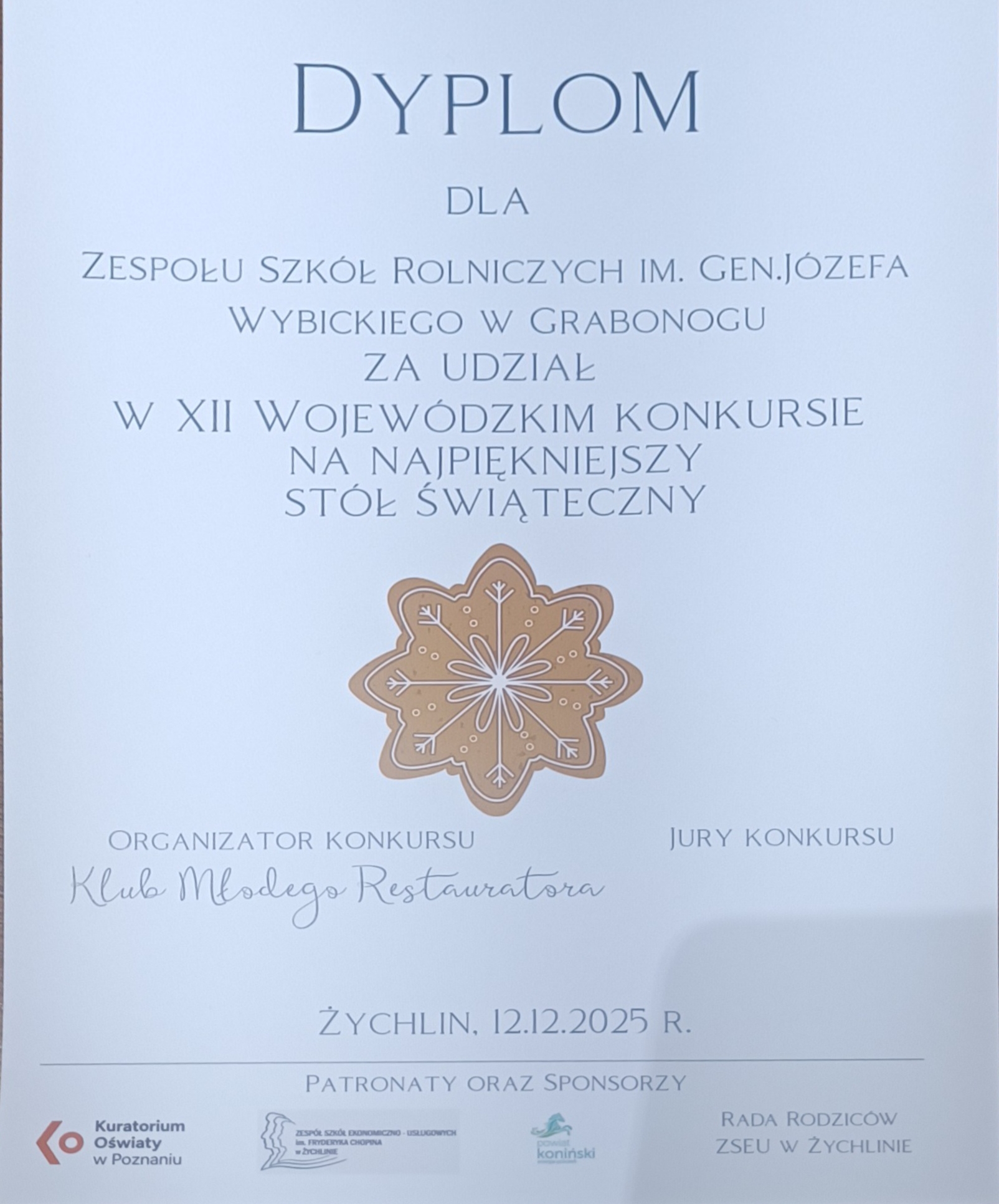 Konkurs odbył się pod hasłem „Stół z nutą piernikową” i został zorganizowany w Zespole Szkół Ekonomiczno-Usługowych im. gen. Fryderyka Chopina w Żychlinie. Z naszej szkoły do konkursu zostały wytypowane dwa dwuosobowe zespoły uczennic. Każdy zespół przygotowywał nakrycie stołu dla czterech osób do zaprezentowanego menu na rodzinną kolację wigilijną. Konkurs był objęty patronatem Kuratorium Oświaty w Poznaniu.