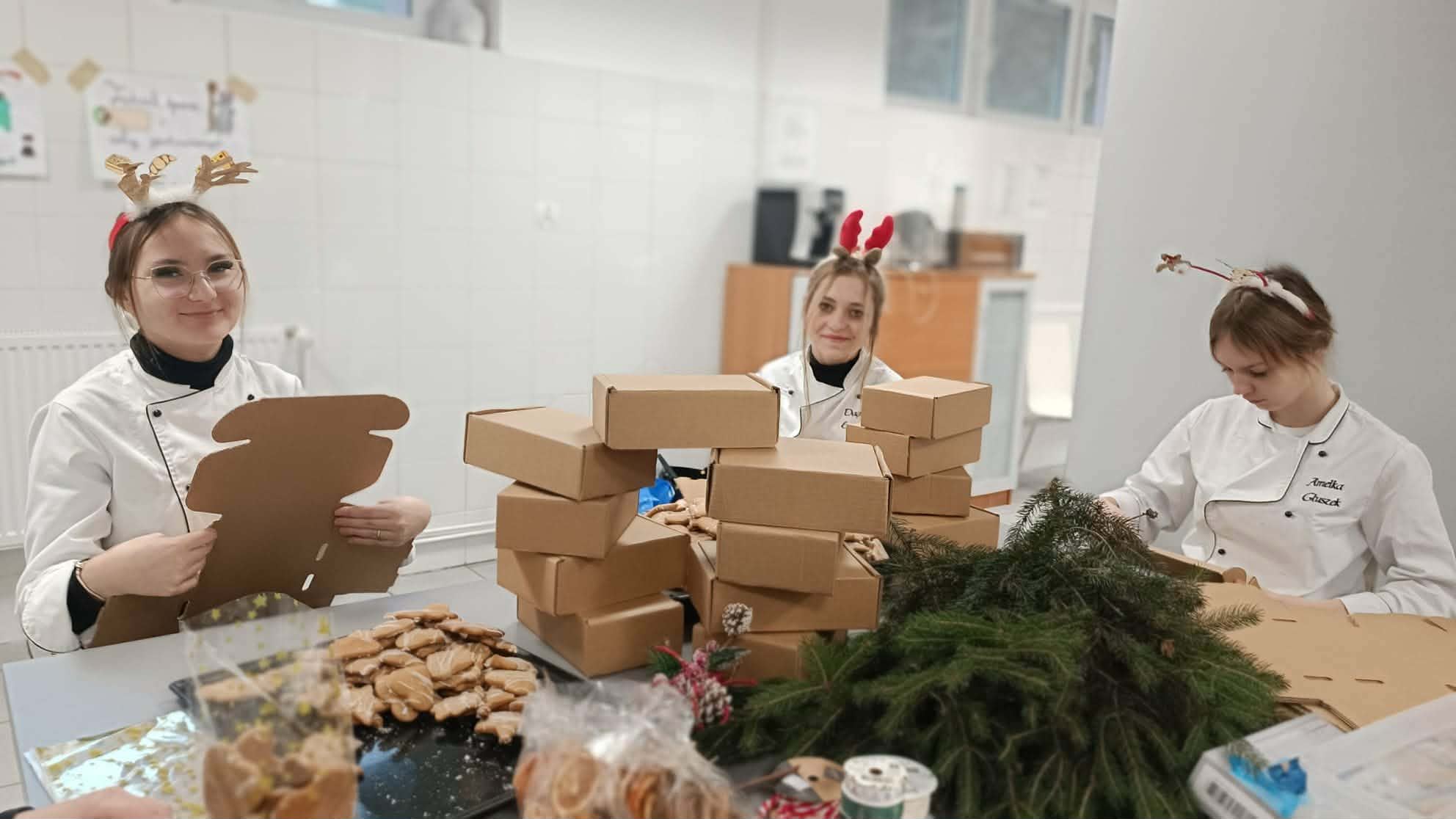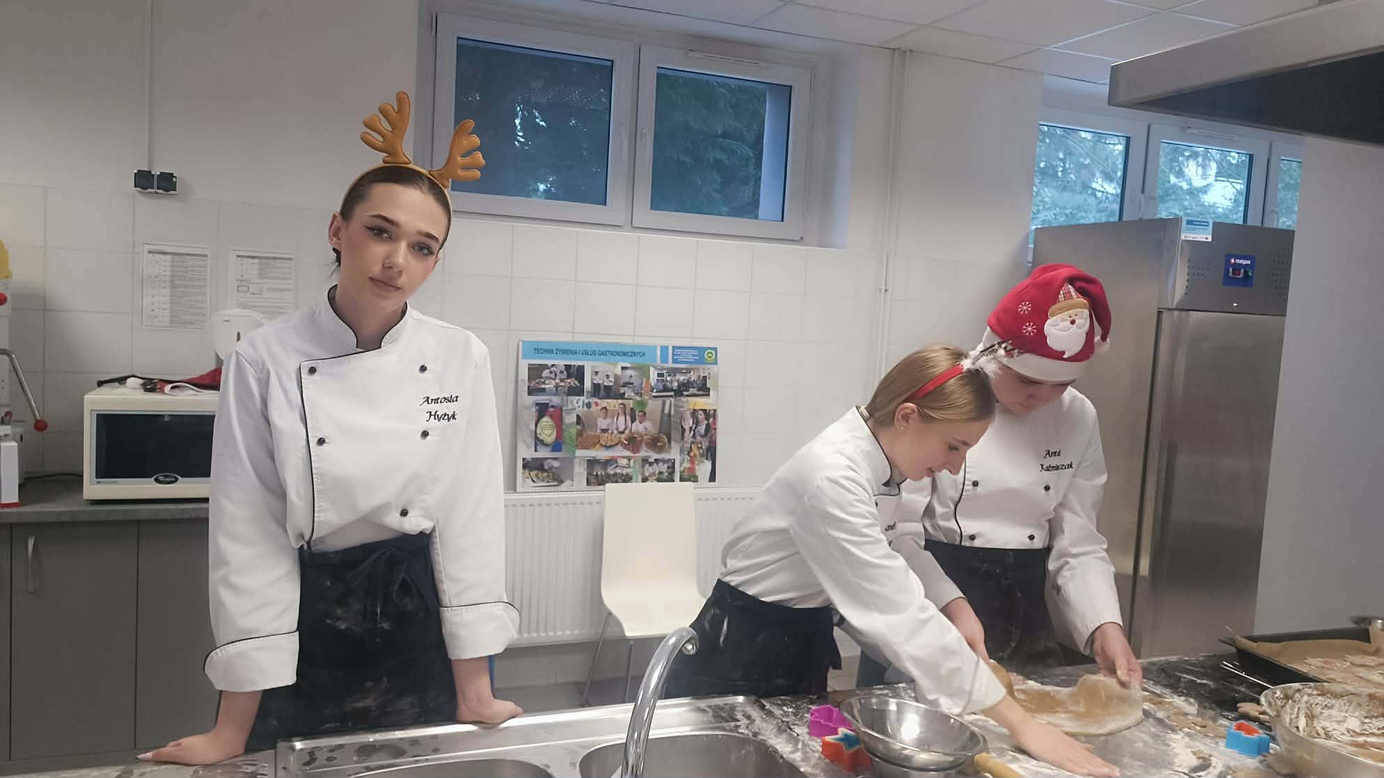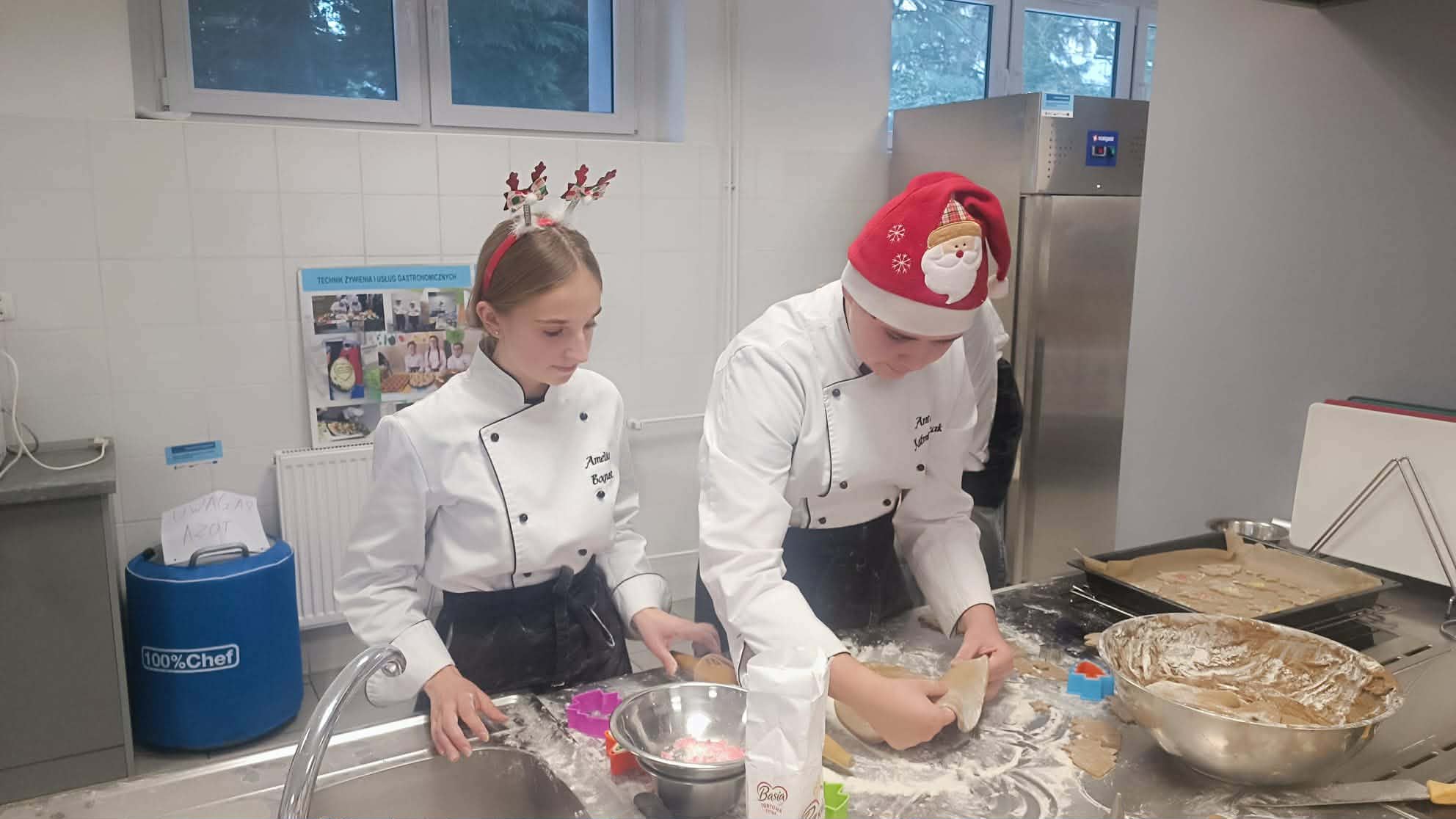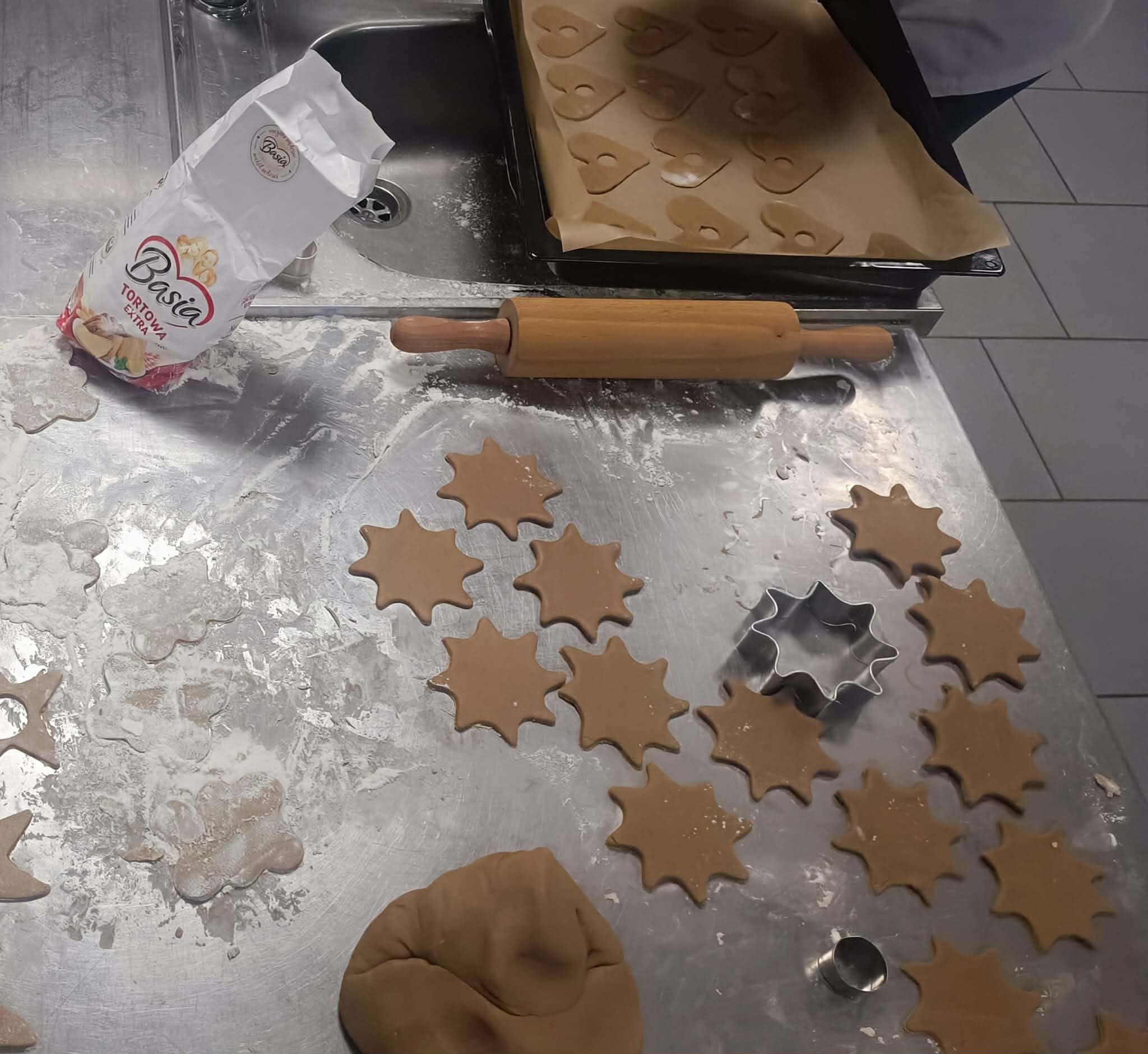 Podczas zajęć młodzież przygotowywała ciasto długodojrzewające, które wymaga cierpliwości i precyzji, aby uzyskać odpowiednią konsystencję i aromat charakterystyczny dla tradycyjnych pierników. Po okresie dojrzewania ciasto zostało wywałkowane i wykrawane w świąteczne kształty, a następnie pieczone w atmosferze pełnej klimatu świątecznego i radosnej pracy zespołowej.
