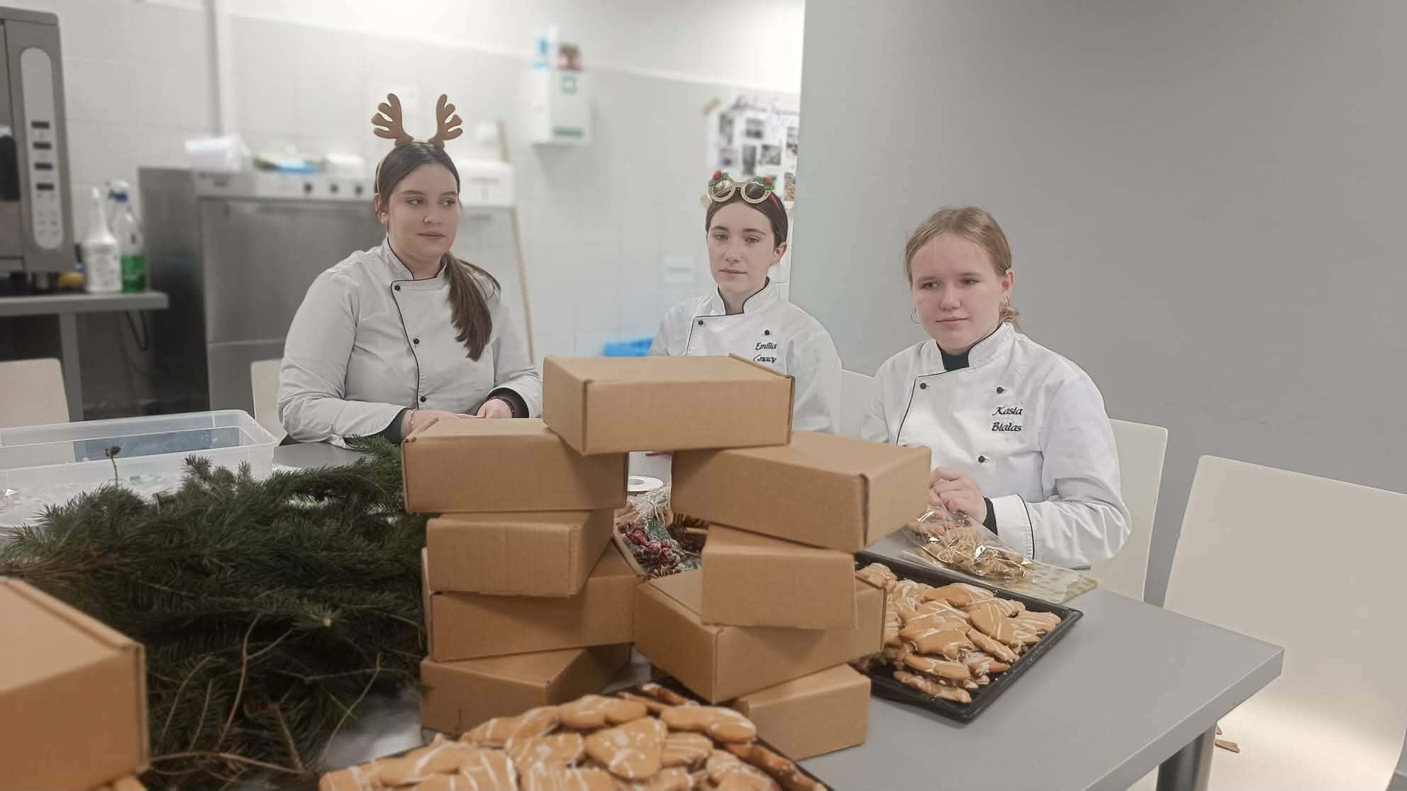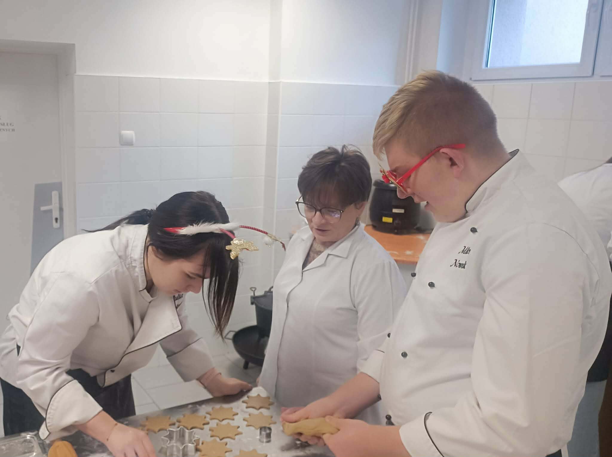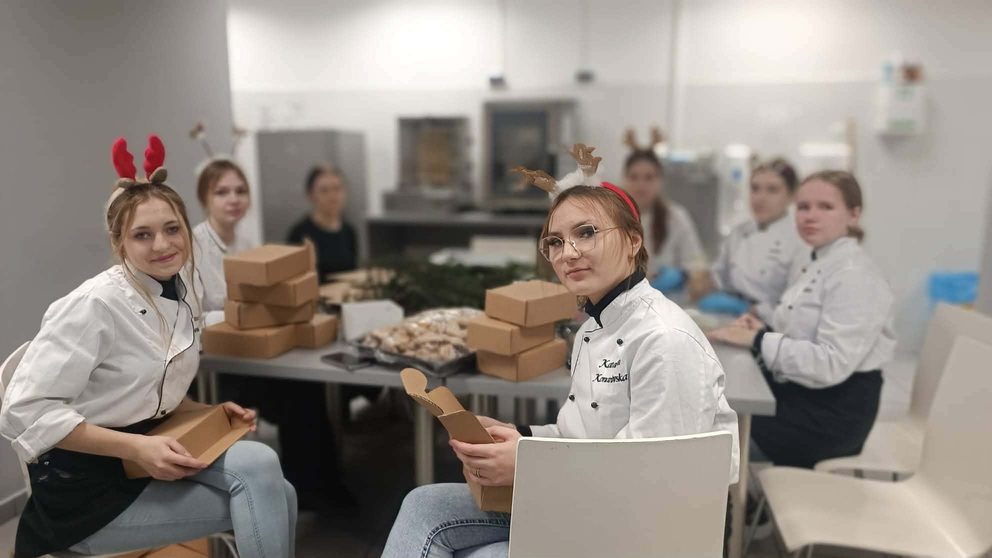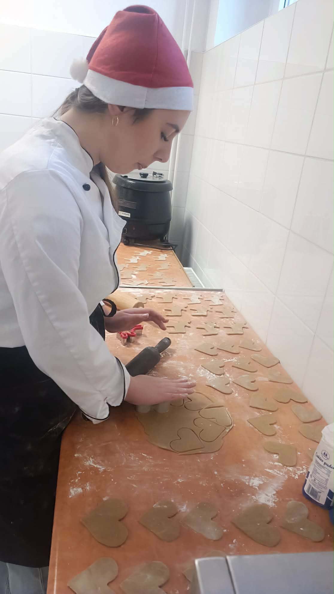 Podczas zajęć młodzież przygotowywała ciasto długodojrzewające, które wymaga cierpliwości i precyzji, aby uzyskać odpowiednią konsystencję i aromat charakterystyczny dla tradycyjnych pierników. Po okresie dojrzewania ciasto zostało wywałkowane i wykrawane w świąteczne kształty, a następnie pieczone w atmosferze pełnej klimatu świątecznego i radosnej pracy zespołowej.