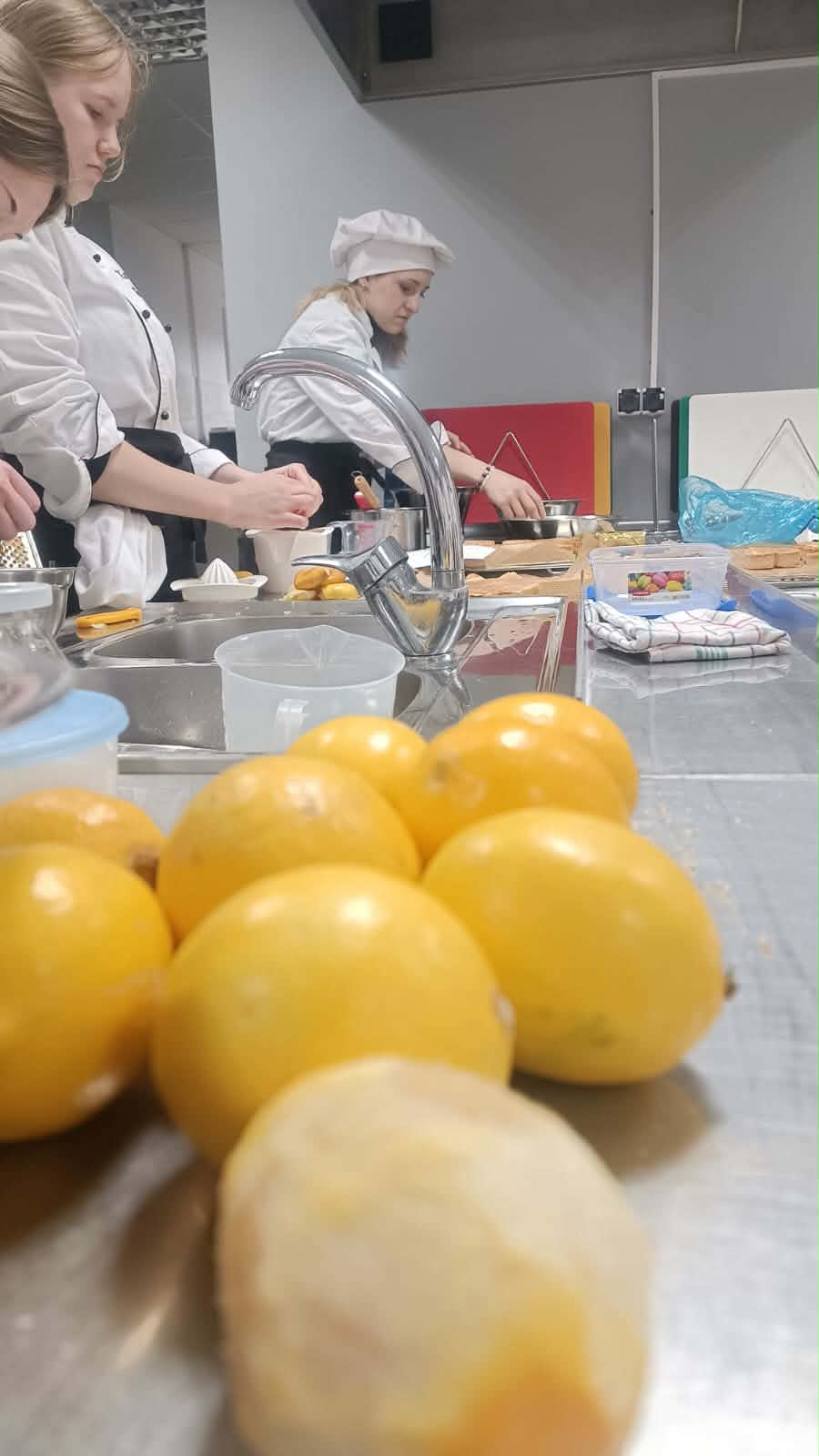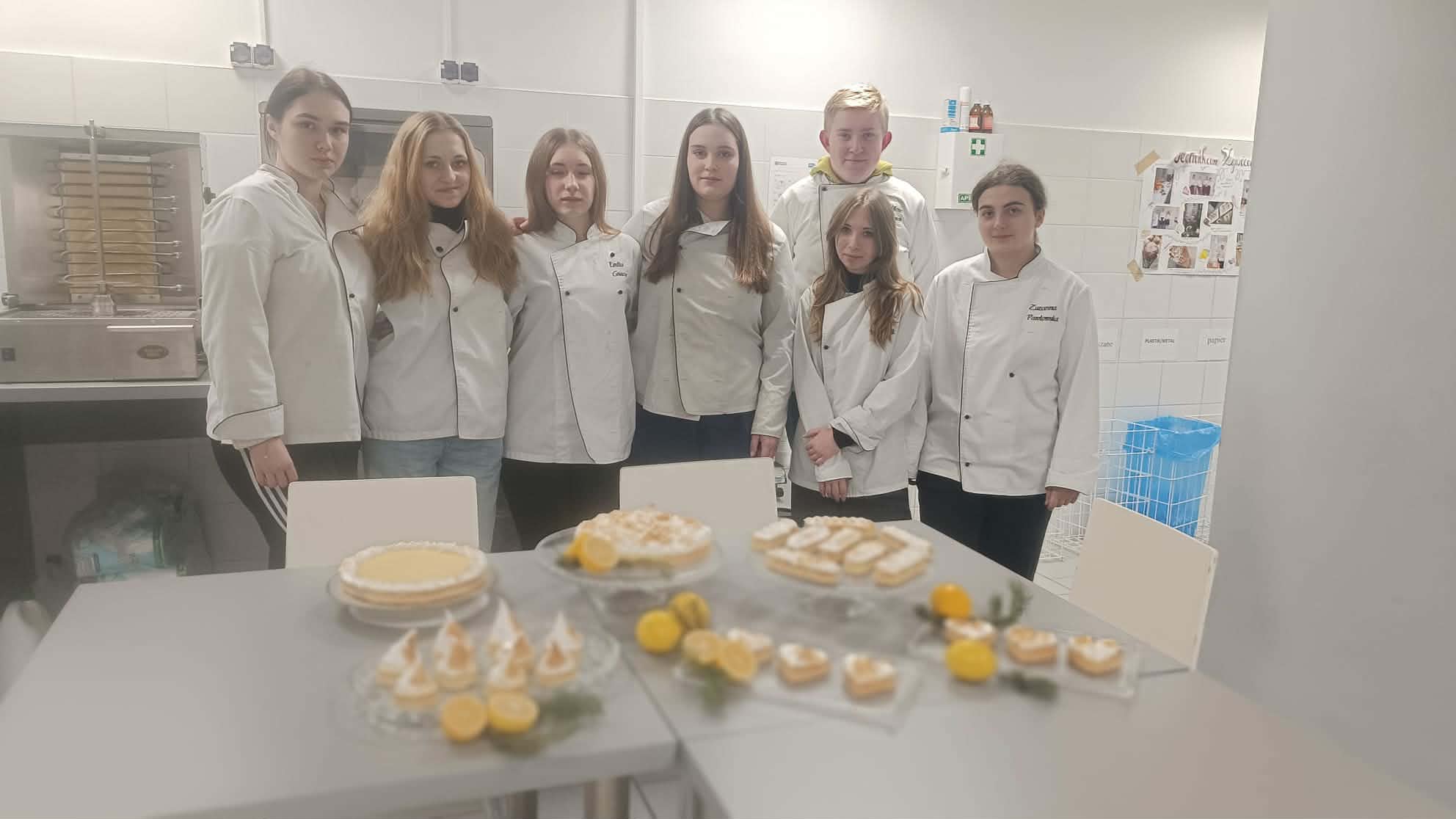Podczas jednego ze spotkań uczniowie klasy trzeciej Technikum Żywienia i Usług Gastronomicznych przygotowywali tartaletki z lemon curd. Praca nad kruchym ciastem i cytrynowym kremem była doskonałym wprowadzeniem do świata monoporcji, wymagającym zarówno precyzji, jak i kreatywności.